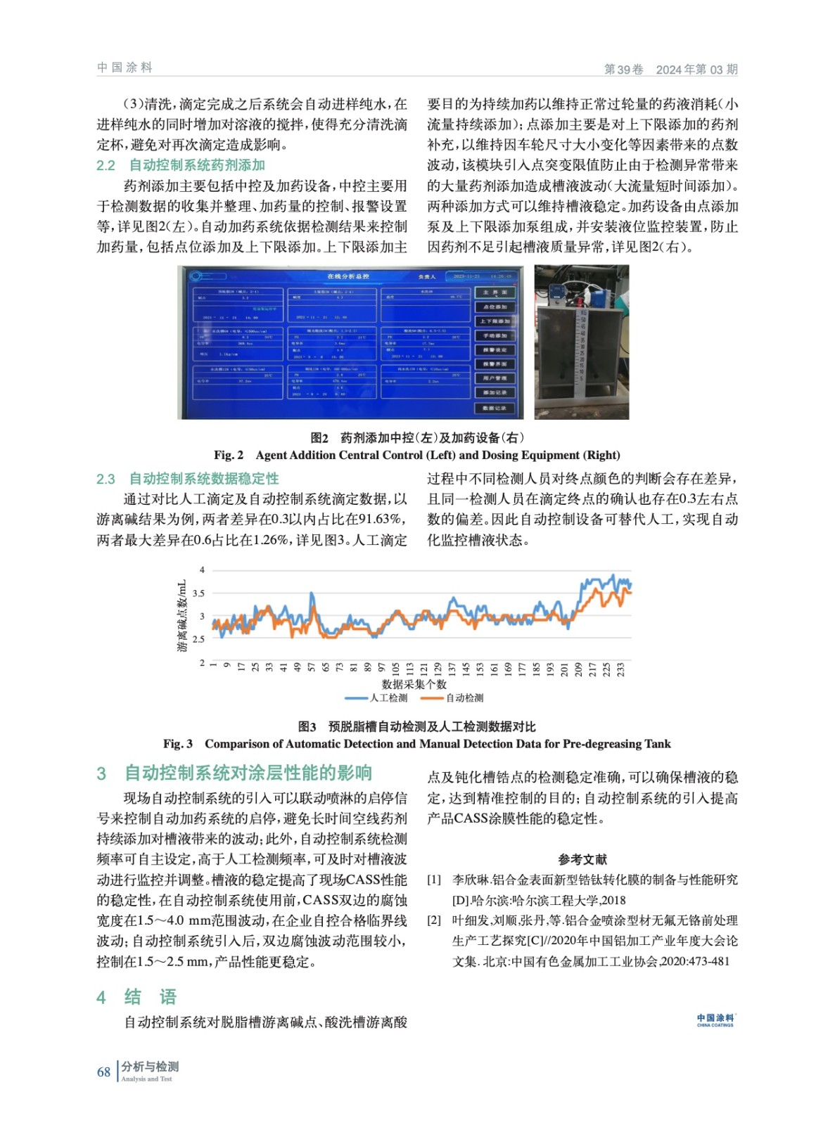 為提升鋁合金車輪涂裝線自動化程度,在涂裝前處理引入自動監控系統。確定游離堿、游離酸及鋯點的檢測方法,依據檢測結果自動調整加藥量。對比人工與設備檢測結果,監控設備運行穩定性。