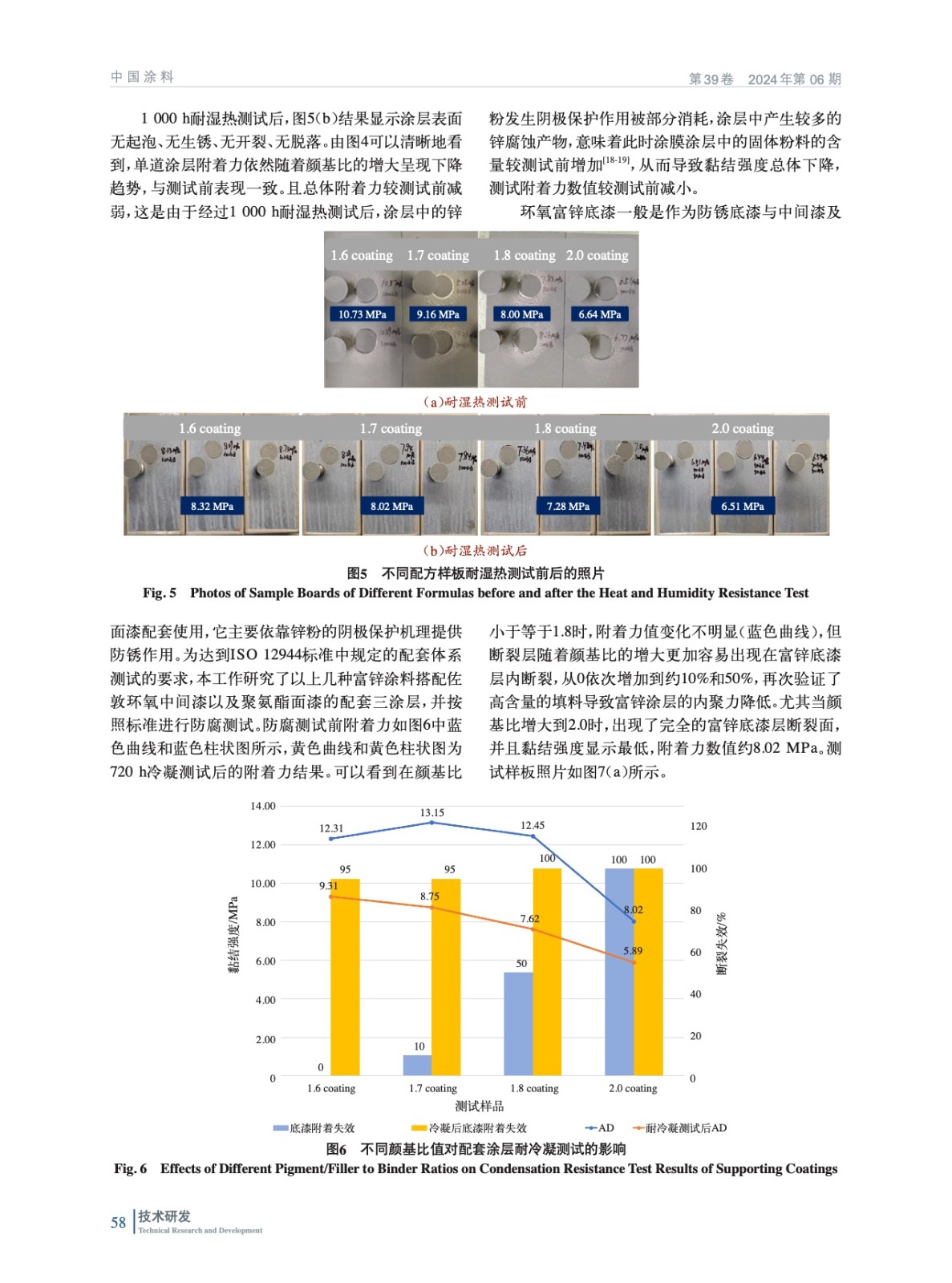 摘要:在80%鋅含量環(huán)氧涂料中,以長石粉作為另一種輔助顏填料,通過改變總顏填料與基料的比例(即顏基比),制備了臨界狀態(tài)附近4種不同顏基比(1.6、1.7、1.8以及2.0)的涂料樣品,并探究了顏基比對涂膜形成結(jié)構(gòu)以及涂膜防腐蝕性能的影響。測試結(jié)果顯示,隨著顏基比的增加,4種測試涂層的吸水率增大,96 h泡水測試后,顏基比為2.0的涂層吸水率約為1.6顏基比涂層的7.8倍;電化學測試Bode圖中低頻阻抗模量(Z0.01 Hz)減小,1.6顏基比涂層的阻抗值約為2.0顏基比涂層阻抗值的10倍,意味著涂層的阻隔性能減弱;連續(xù)冷凝、耐鹽霧以及耐濕熱防腐測試后涂膜的附著力均有所降低,表明了涂膜的防腐性能降低。盡管顏基比越高涂料的價格降低,但從環(huán)氧富鋅底漆應具備良好的防銹性能再追求性價比的角度考慮,顏基比建議不高于2.0,以確保防腐測試后涂層仍具有優(yōu)異的附著力(不低于5 MPa)。