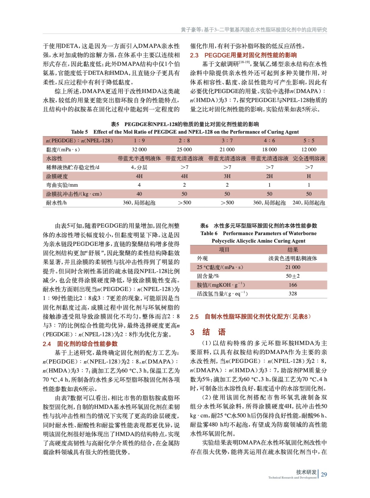 摘要:為了解決脂環胺在環氧固化劑中水性化的難點,以4,4'–二氨基二環己基甲烷(H12MDA)為基礎胺,1,3–丙二胺(DMAPA)兼作親水改性劑,與液體環氧樹脂(NPEL-128)和聚乙二醇二縮水甘油醚(PEGDGE)合成水性環氧固化劑,同時設置對照組以二亞乙基三胺(DETA)作為親水改性劑,探究了具有叔胺結構的1,3–丙二胺(DMAPA)對HMDA的親水改性效果,優化了非離子親水擴鏈劑聚乙二醇二縮水甘油醚(PEGDGE)的用量。結果表明,DMAPA的親水性遠高于二亞乙基三胺為代表的常規脂肪胺,所得固化劑黏度適中、水溶性良好,固化劑制備所得涂膜具有高硬度、高耐沖擊性及優異的耐水、耐鹽霧性能。