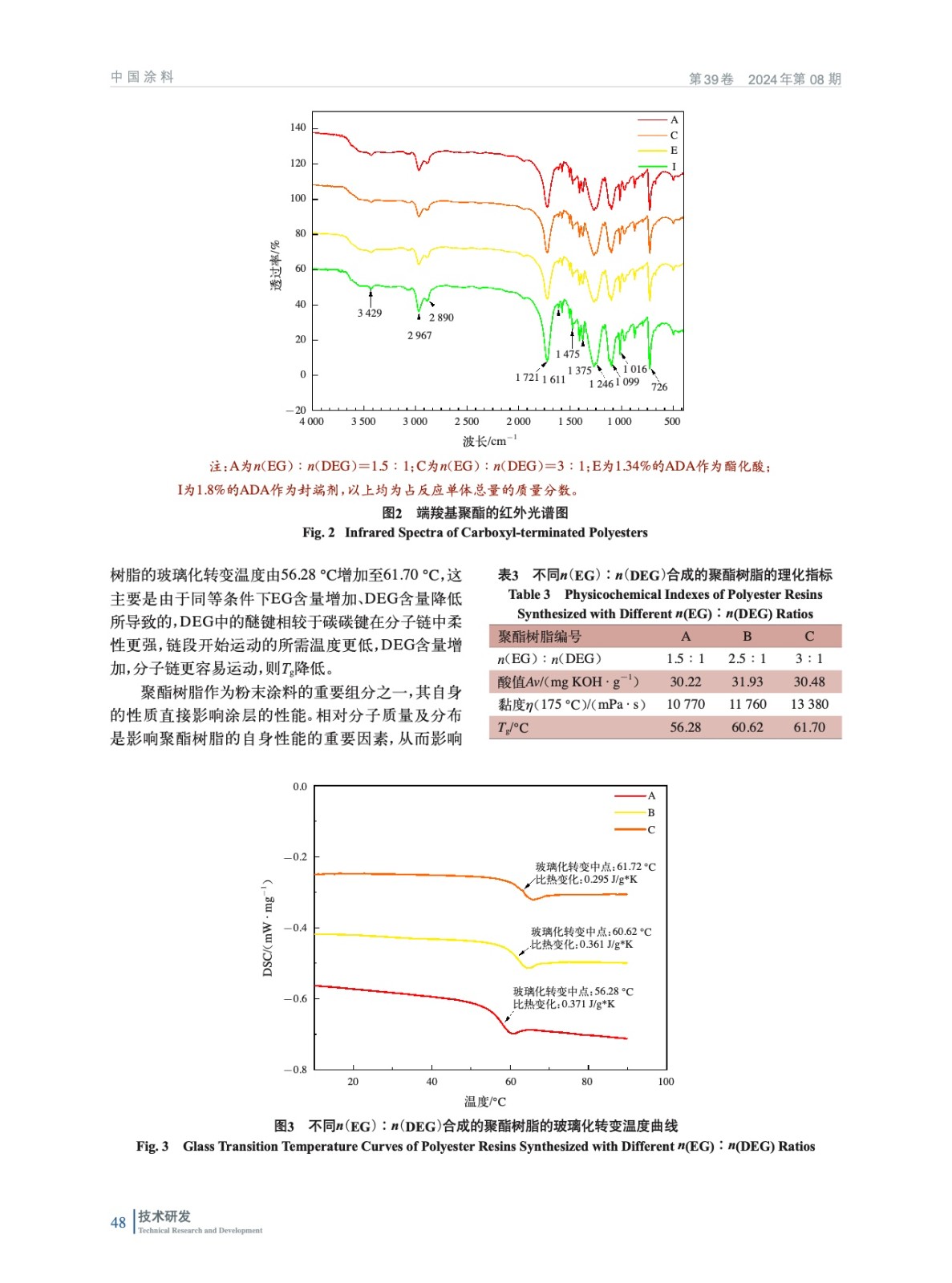 摘要:介紹了一種戶內平面用高流平β–羥烷基酰胺(HAA)固化聚酯樹脂的合成方法及其在粉末涂料涂層中表現。探討了不同聚酯樹脂的合成配方及工藝對于聚酯理化指標及涂層性能的影響,通過紅外光譜(FITR)分析了聚酯的微觀結構,利用凝膠滲透色譜儀(GPC)獲得了一系列聚酯樹脂的分子量及其分布,并通過掃描電子顯微鏡(SEM)觀察了涂層的斷面形貌。結果表明:n(EG)∶n(DEG)為2.774∶1,NPG占酯化醇物質的量比為55%,PTA作為酯化酸,ADA與IPA共同作為封端劑,其中ADA占單體總量1.8%(質量分數)時合成的聚酯樹脂,其粉末涂層具有優異的流平性能和機械性能,50 kg·cm正、反沖擊均可通過。
