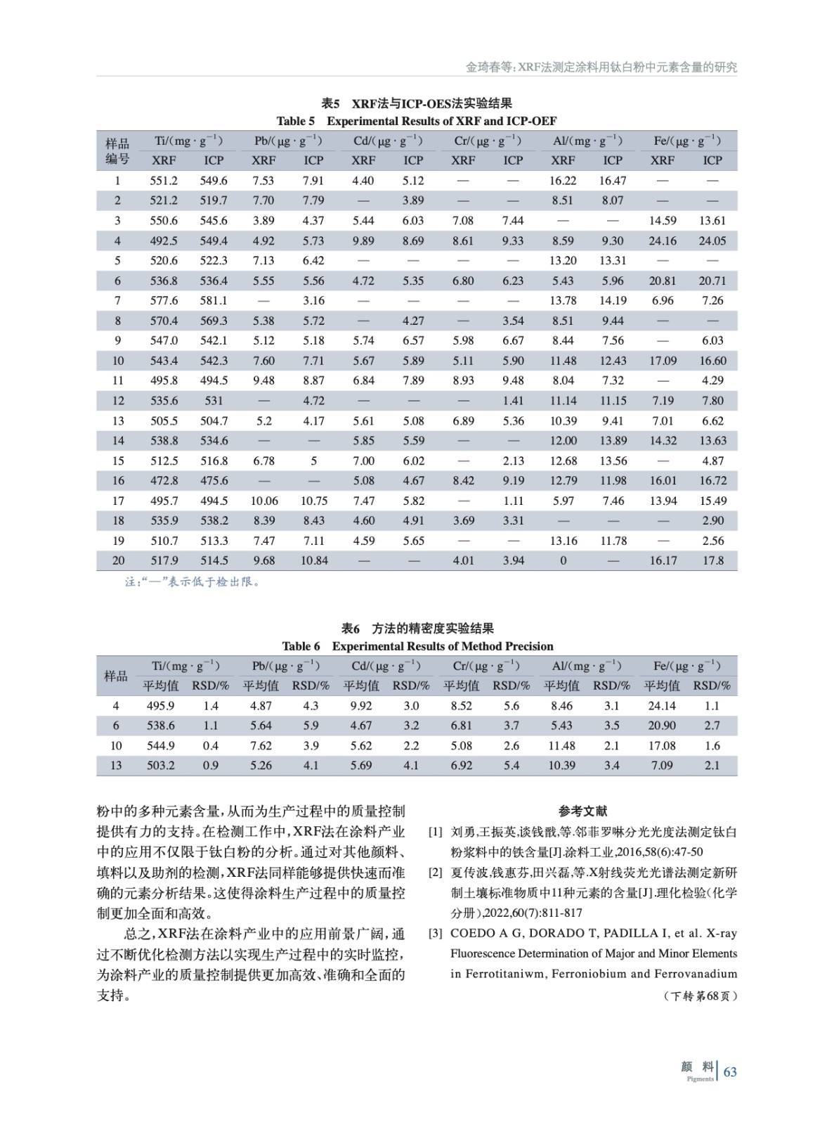 摘要:研究采用壓片制樣–X射線熒光光譜測定技術(shù),使用9種配制鈦白粉作為校準(zhǔn)樣本,建立了一種能夠同時測定鈦白粉中6種元素成分的方法。研究中,實驗深入探討壓片制樣中制樣壓力和時間對元素含量檢測結(jié)果的影響,并據(jù)此確認(rèn)樣品制備條件。同時,實驗針對基體效應(yīng)及譜線重疊干擾校正等問題進行研究,通過軟件提供的多元線性回歸分析模型,以經(jīng)驗法建立各元素分析的校準(zhǔn)曲線,并基于3倍背景信號波動的標(biāo)準(zhǔn)偏差計算出各元素的檢出限(3 s)。為了進一步驗證方法的精密度,實驗不同鈦白粉樣品進行測試,測定值的相對標(biāo)準(zhǔn)偏差(n=10)為0.4%~5.9%。實驗結(jié)果表明,鈦白粉X射線熒光光譜測定的關(guān)鍵條件方法,包括檢出限、準(zhǔn)確度及重復(fù)性等,均能滿足日常分析檢測的要求,對實驗室的鈦白粉檢測工作具有重要的指導(dǎo)意義。