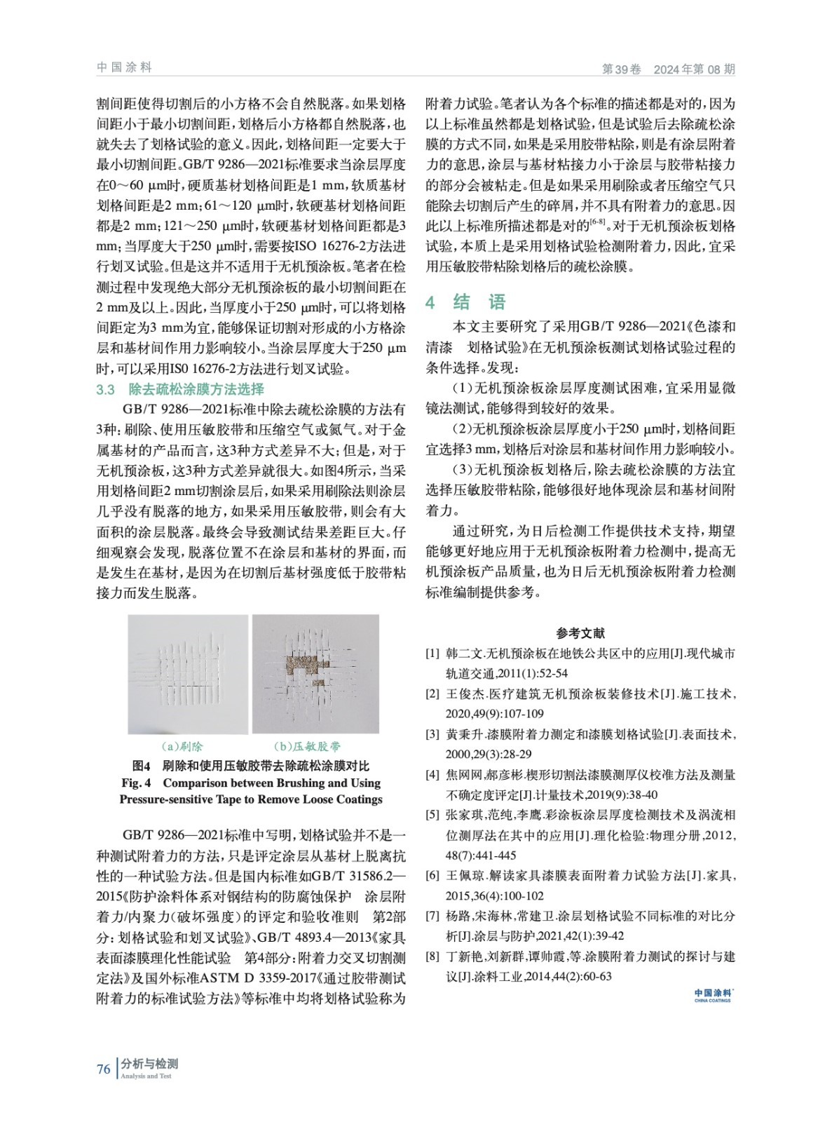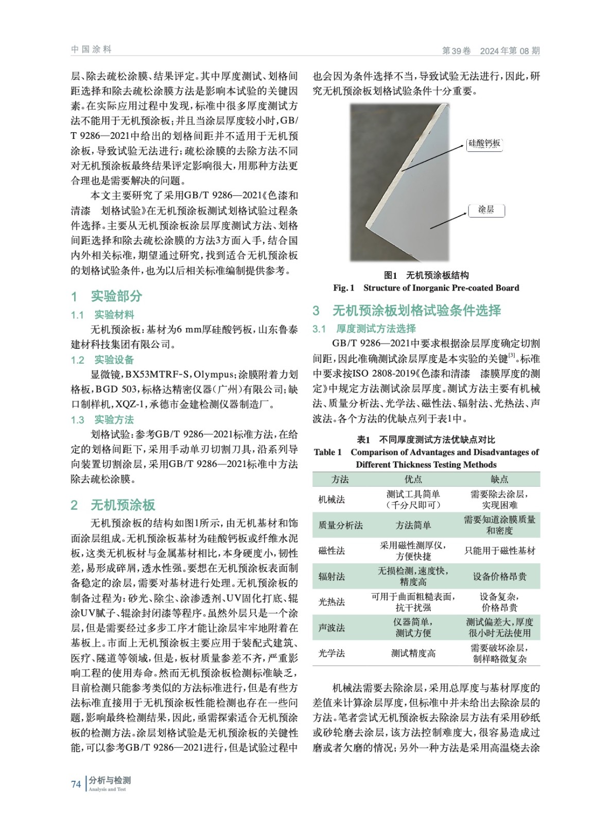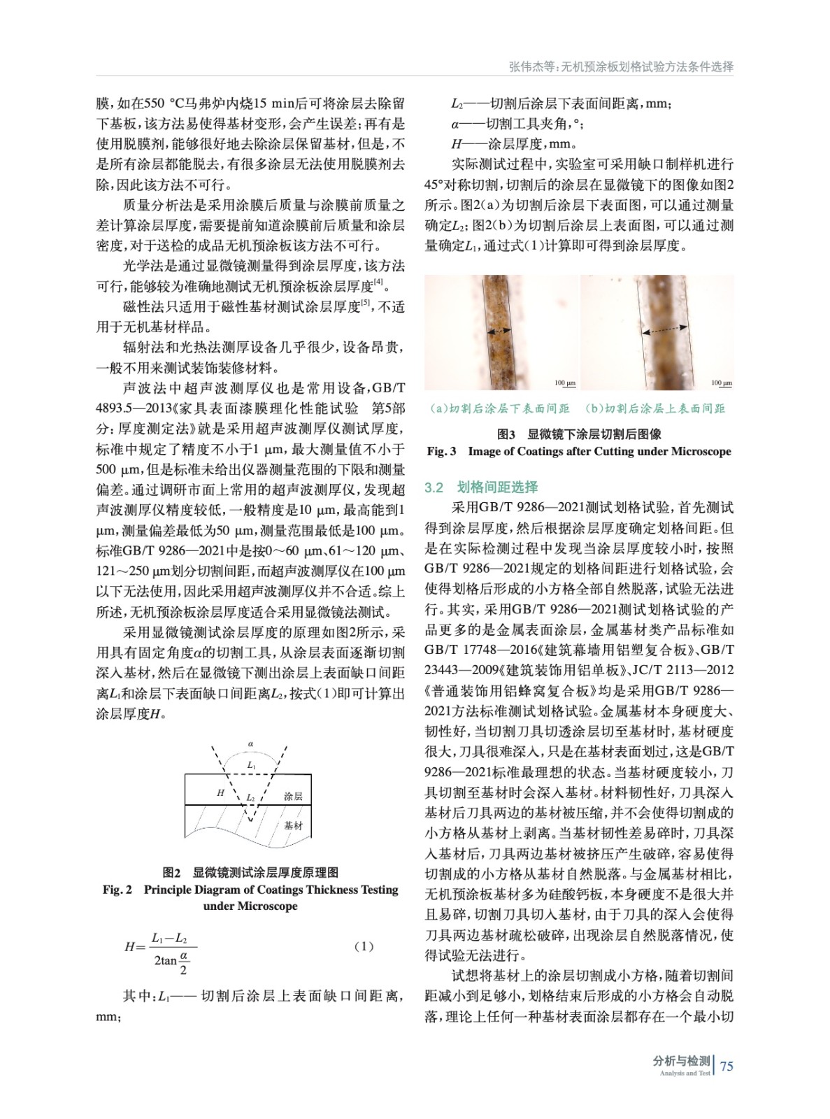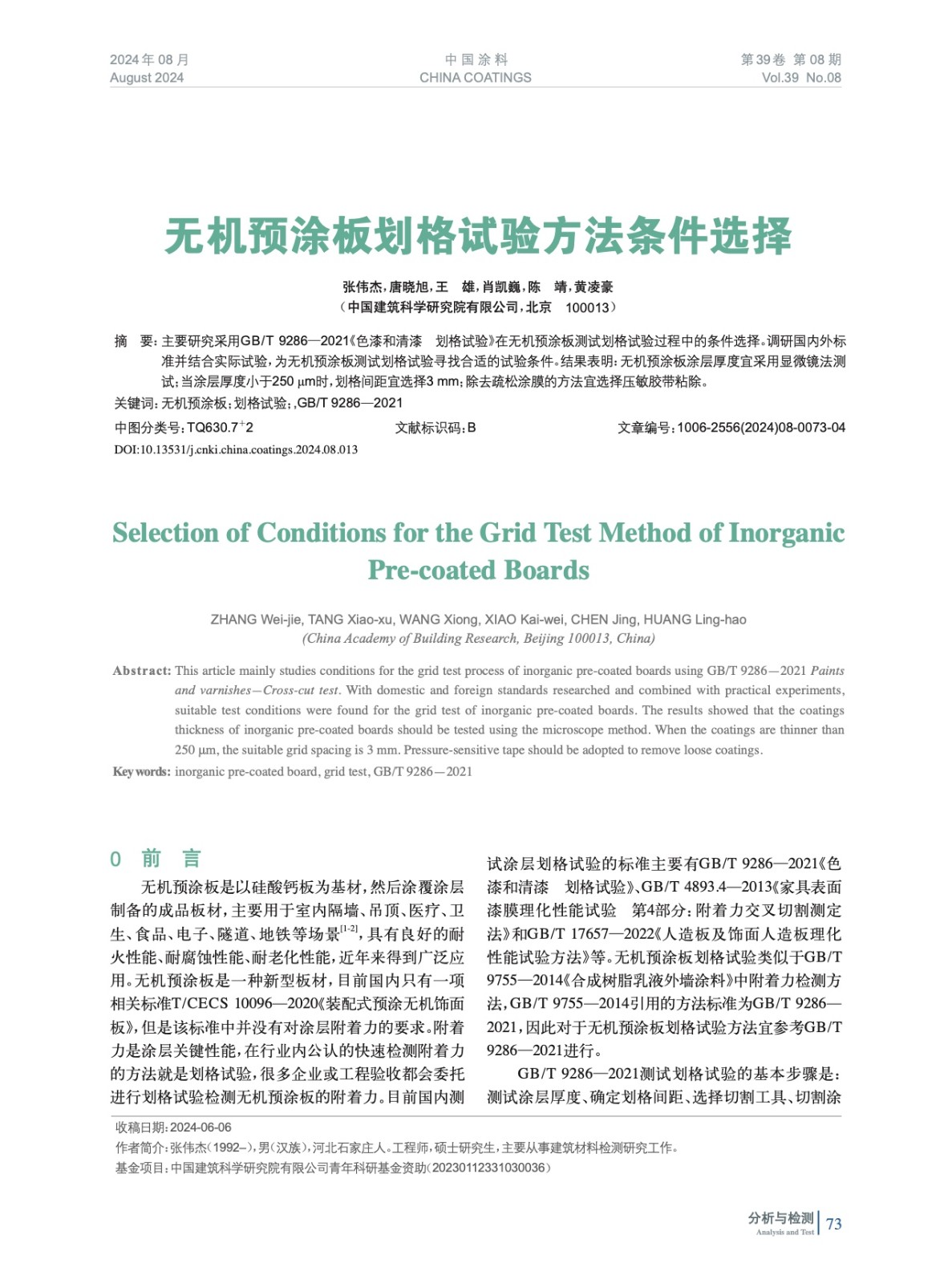 摘要:主要研究采用GB/T 9286—2021《色漆和清漆 劃格試驗》在無機預涂板測試劃格試驗過程中的條件選擇。調(diào)研國內(nèi)外標準并結(jié)合實際試驗,為無機預涂板測試劃格試驗尋找合適的試驗條件。結(jié)果表明:無機預涂板涂層厚度宜采用顯微鏡法測試;當涂層厚度小于250 μm時,劃格間距宜選擇3 mm;除去疏松涂膜的方法宜選擇壓敏膠帶粘除。