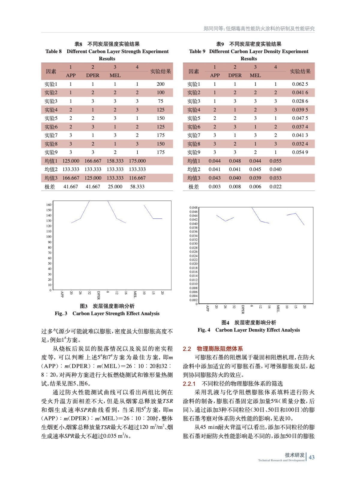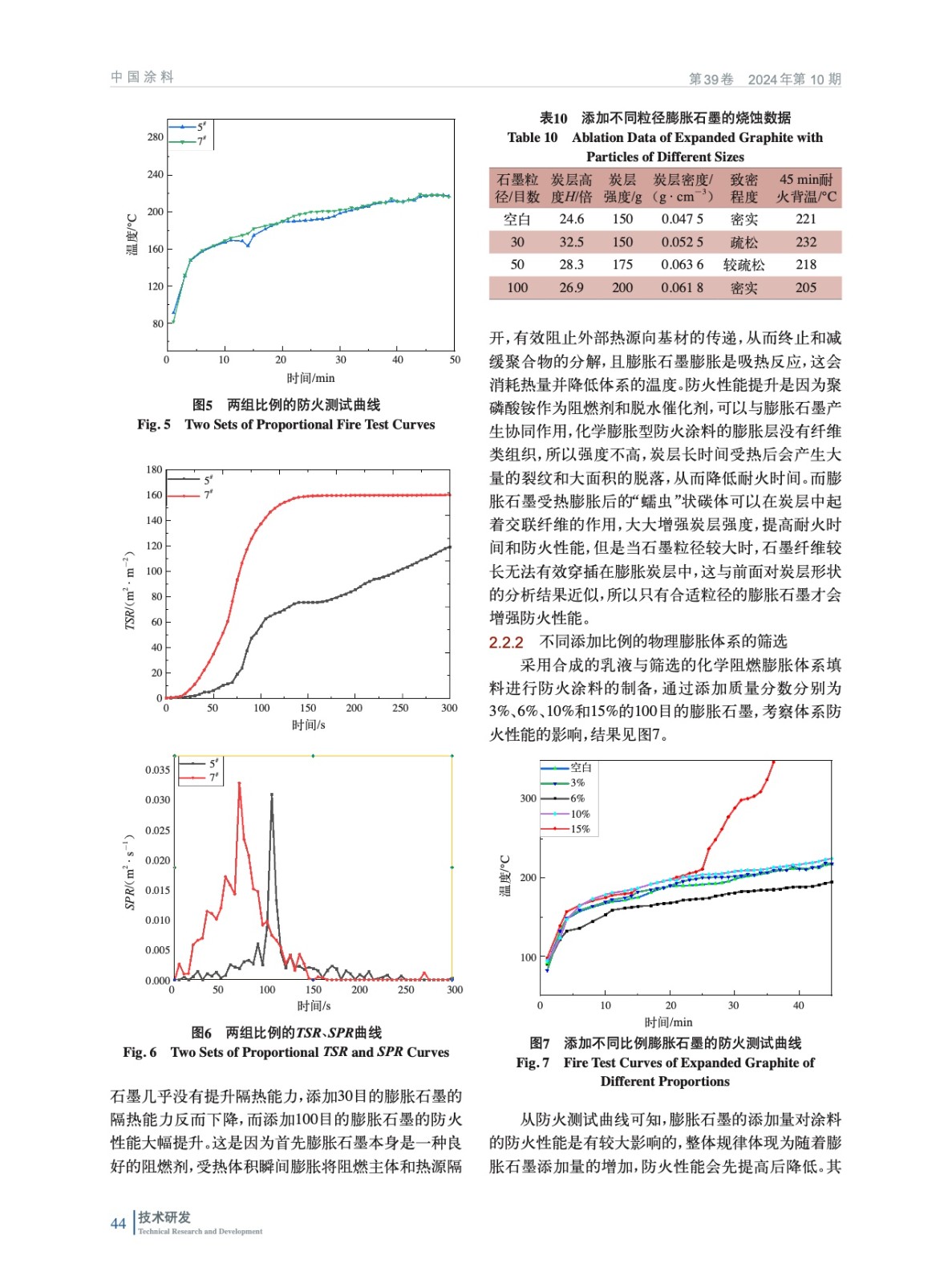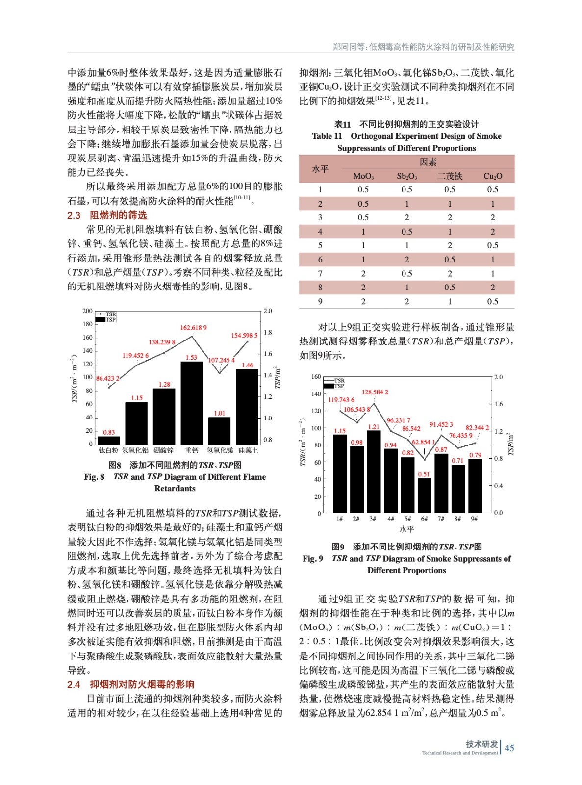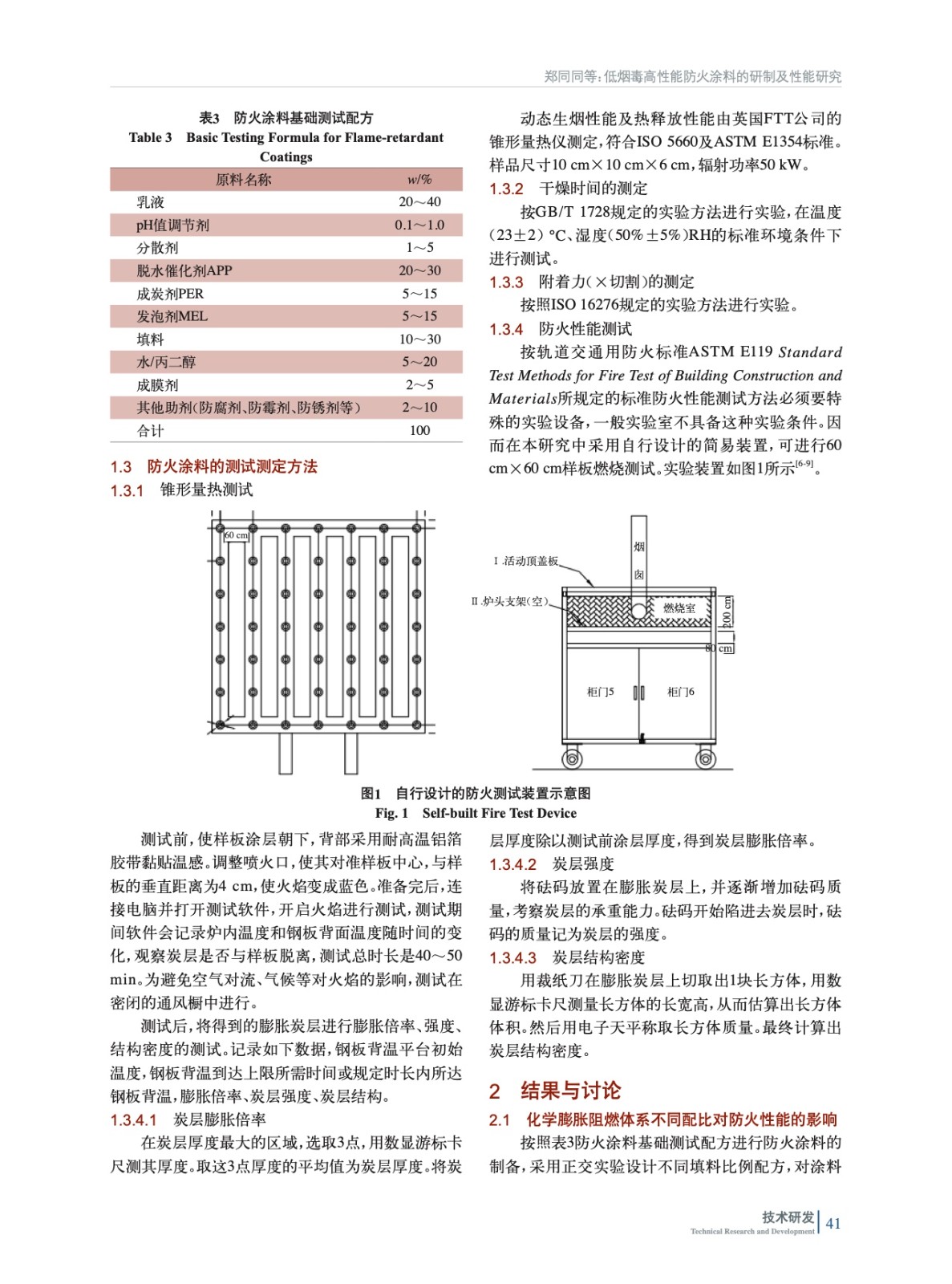 摘要:通過研究防火涂料膨脹填料的協同性、防火涂料無機阻燃劑及抑煙劑的種類和比例,并通過自制燃燒測試裝置和錐形量熱測試表征防火性能和煙毒性,開發出一款適用于軌道交通車輛的低煙毒高性能的水性防火涂料。以常規水性VAE防火乳液為成膜基料,化學膨脹填料選用m(硅烷包覆聚磷酸銨)∶m(雙季戊四醇)︰m(三聚氰胺)=26︰12︰20,物理阻燃膨脹體系選用添加配方總量質量分數6%的100目膨脹石墨;無機阻燃劑選用鈦白粉、氫氧化鎂,抑煙劑選用m(MoO3)︰m(Sb2O3)︰m(二茂鐵)︰m(CuO2)=1︰2︰0.5︰1,防火涂料煙霧總釋放量低于70 m2/m2,總產煙量不超過0.5 m2且耐火性能達到45 min,背溫低于200 ℃。