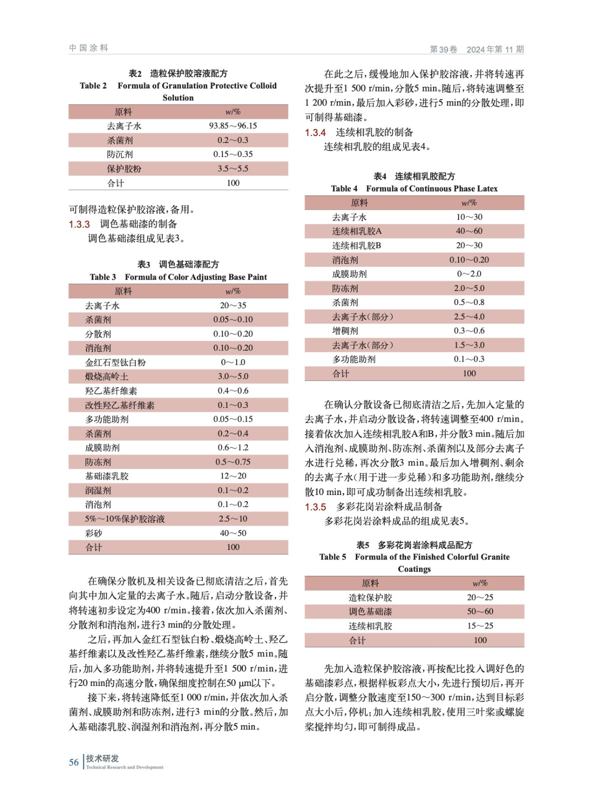摘要:研發了一種彩砂調色的多彩冠晶石涂料,系統地研究了不同保護膠、纖維素、潤濕劑和乳膠的種類、用量對多彩冠晶石涂料的彩點展色性、施工韌性、質感效果、耐水白性和耐人工老化性的影響。研究結果表明:保護膠為UNQ633,造粒保護膠溶液濃度在5%,造粒保護膠溶液占比為20%;基礎漆保護膠溶液濃度為10%,基礎漆保護膠溶液用量為4.5%,纖維素250HHBR用量為0.45%(質量分數,后同),疏水改性纖維素HE10K用量為0.15%,潤濕劑W-2520的用量為0.2%,基礎漆乳膠8027用量為16%,彩點占比為60%;使用惰性乳膠RS-3798A和反應型乳膠RS-3765作為連續相乳膠,其中RS-3765用量為25%、3798A用量為50%,連續相占比為20%。其制得的多彩冠晶石涂料在耐水白性、彩點展色性、彩點韌性、施工韌性、彩點質感效果以及耐堿性、耐酸雨性、耐水性、耐洗刷性、耐濕冷熱循環性、耐人工老化性等方面均符合HG/T 4343—2024《水性多彩建筑涂料》的要求。彩砂作為調色的主要骨料,具備極高的耐候性和耐水性,無需添加水性色漿,克服了傳統多彩涂料因使用水性色漿調色而帶來的褪色、發花等質量風險。