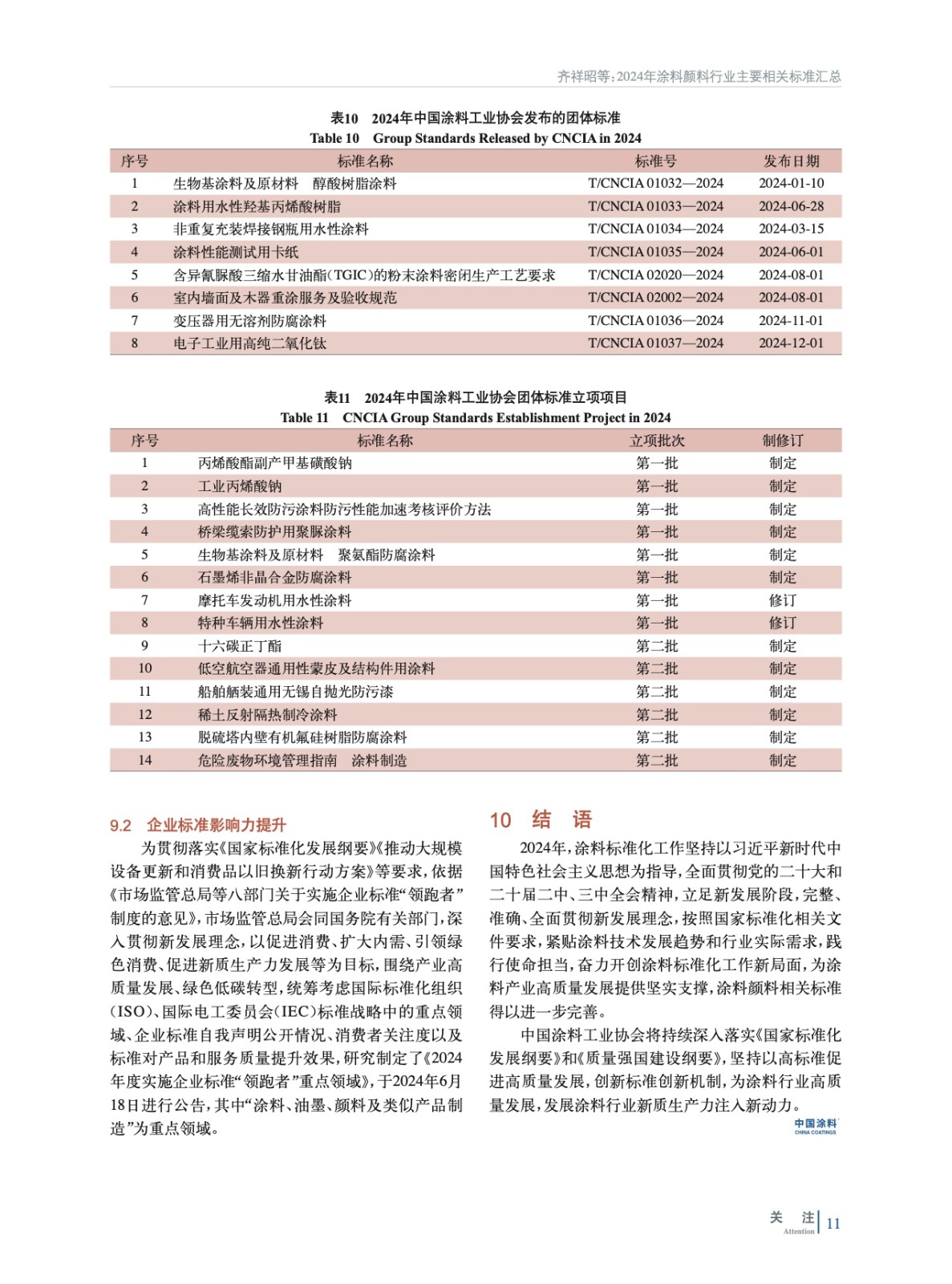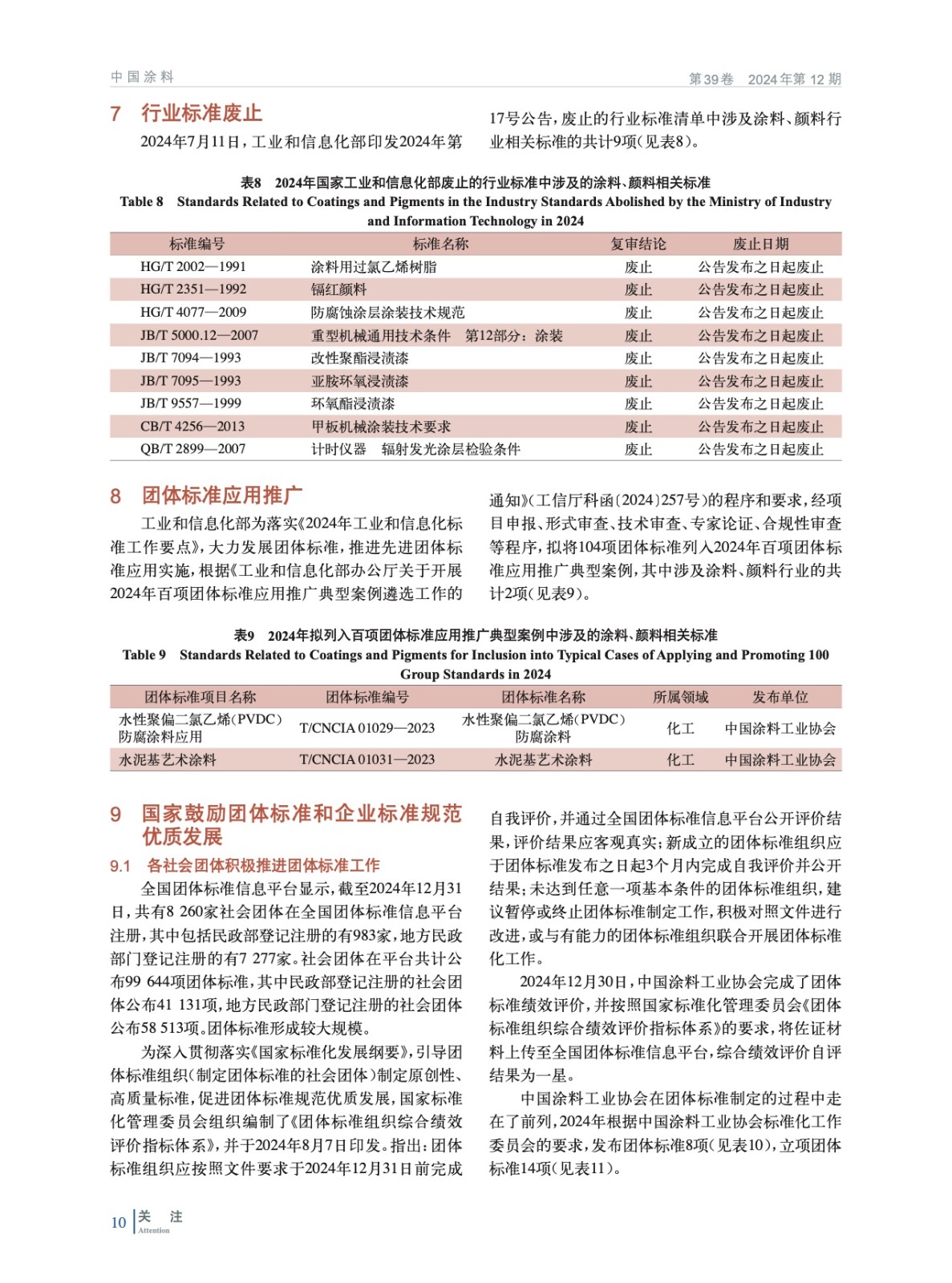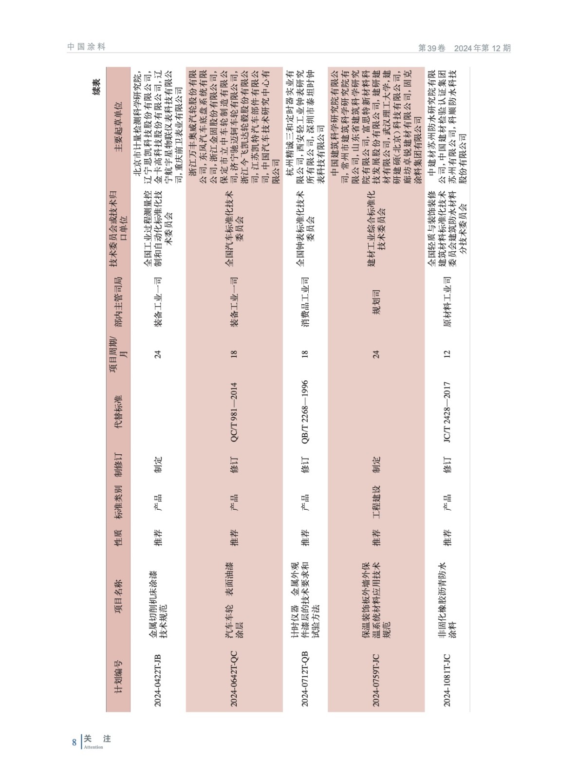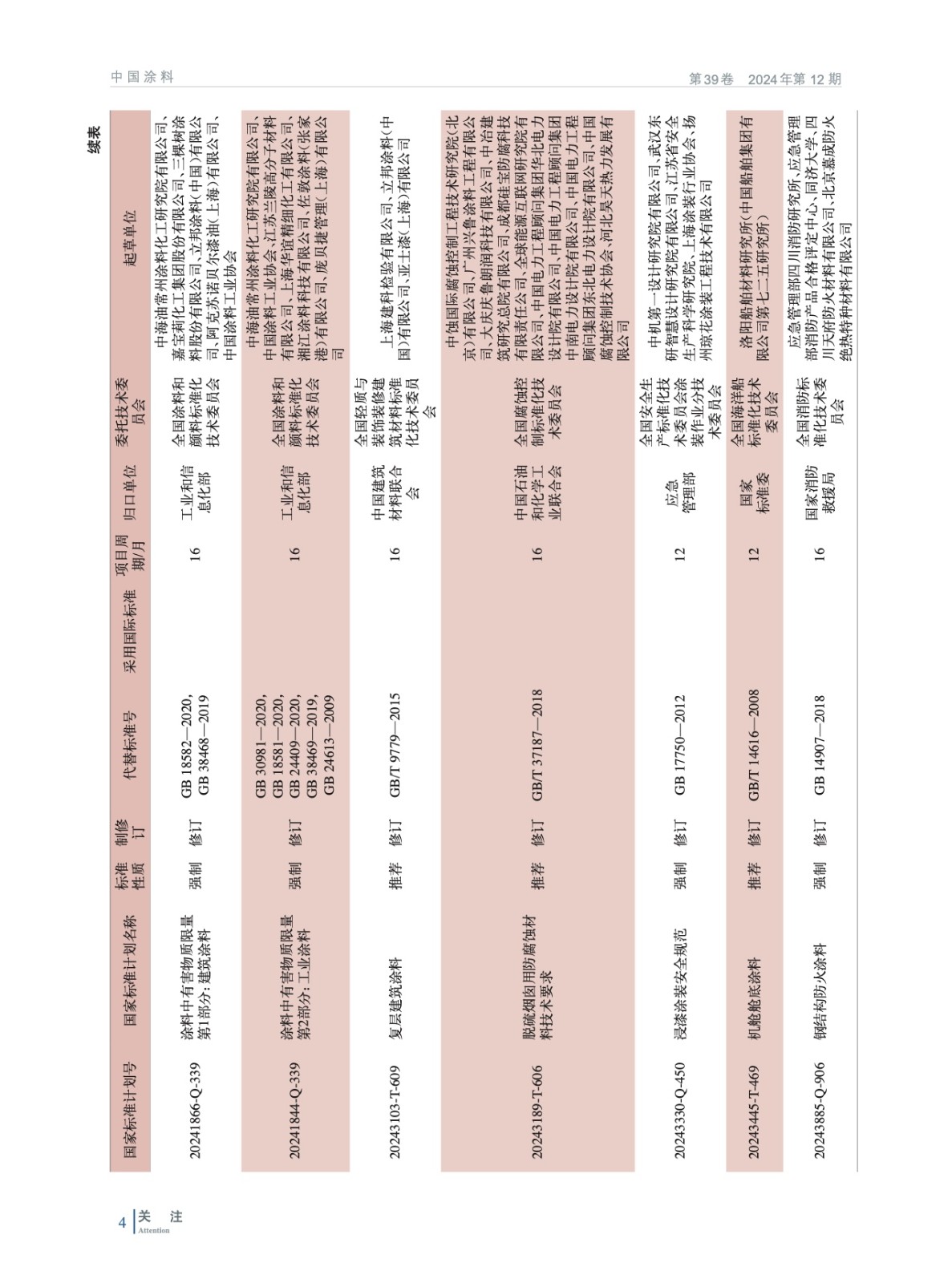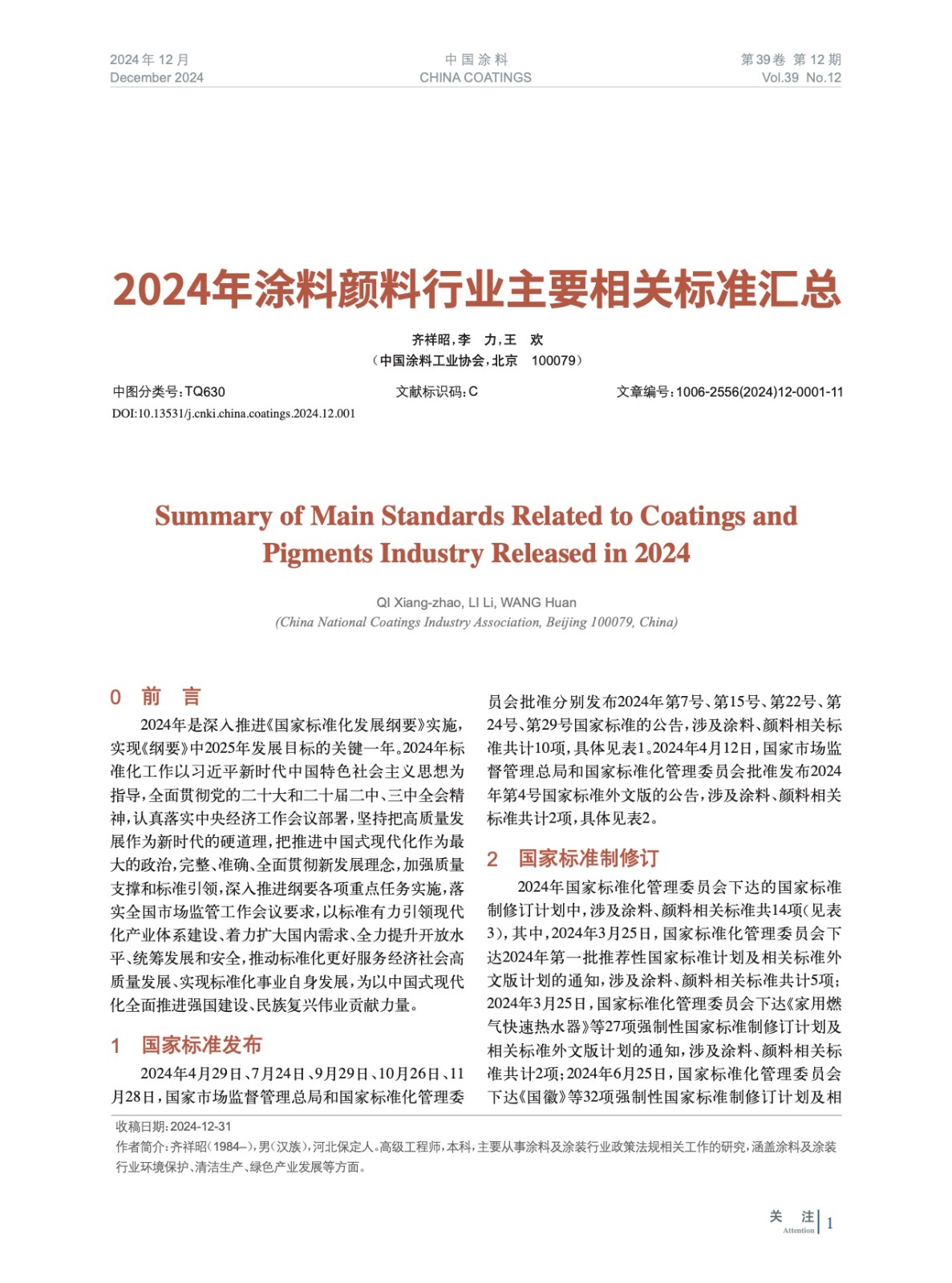 摘要:2024年,涂料標(biāo)準(zhǔn)化工作堅(jiān)持以習(xí)近平新時(shí)代中國(guó)特色社會(huì)主義思想為指導(dǎo),全面貫徹黨的二十大和二十屆二中、三中全會(huì)精神,立足新發(fā)展階段,完整、準(zhǔn)確、全面貫徹新發(fā)展理念,按照國(guó)家標(biāo)準(zhǔn)化相關(guān)文件要求,緊貼涂料技術(shù)發(fā)展趨勢(shì)和行業(yè)實(shí)際需求,踐行使命擔(dān)當(dāng),奮力開創(chuàng)涂料標(biāo)準(zhǔn)化工作新局面,為涂料產(chǎn)業(yè)高質(zhì)量發(fā)展提供堅(jiān)實(shí)支撐,涂料顏料相關(guān)標(biāo)準(zhǔn)得以進(jìn)一步完善。