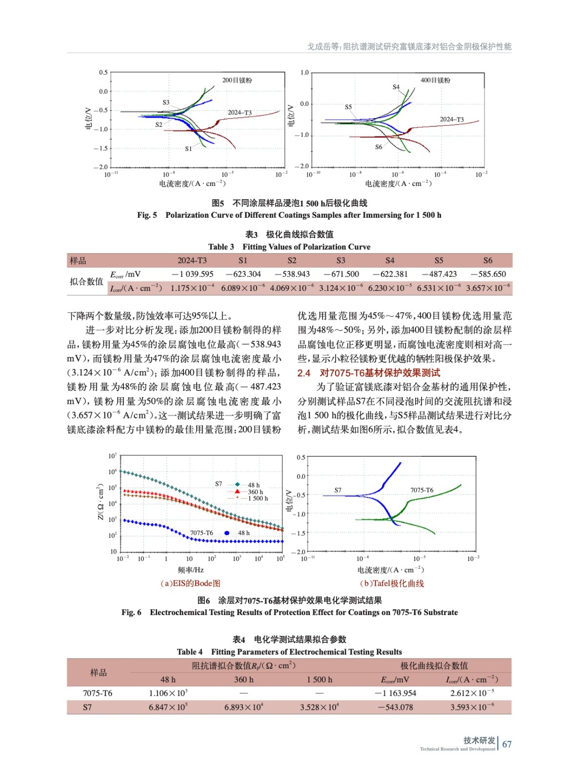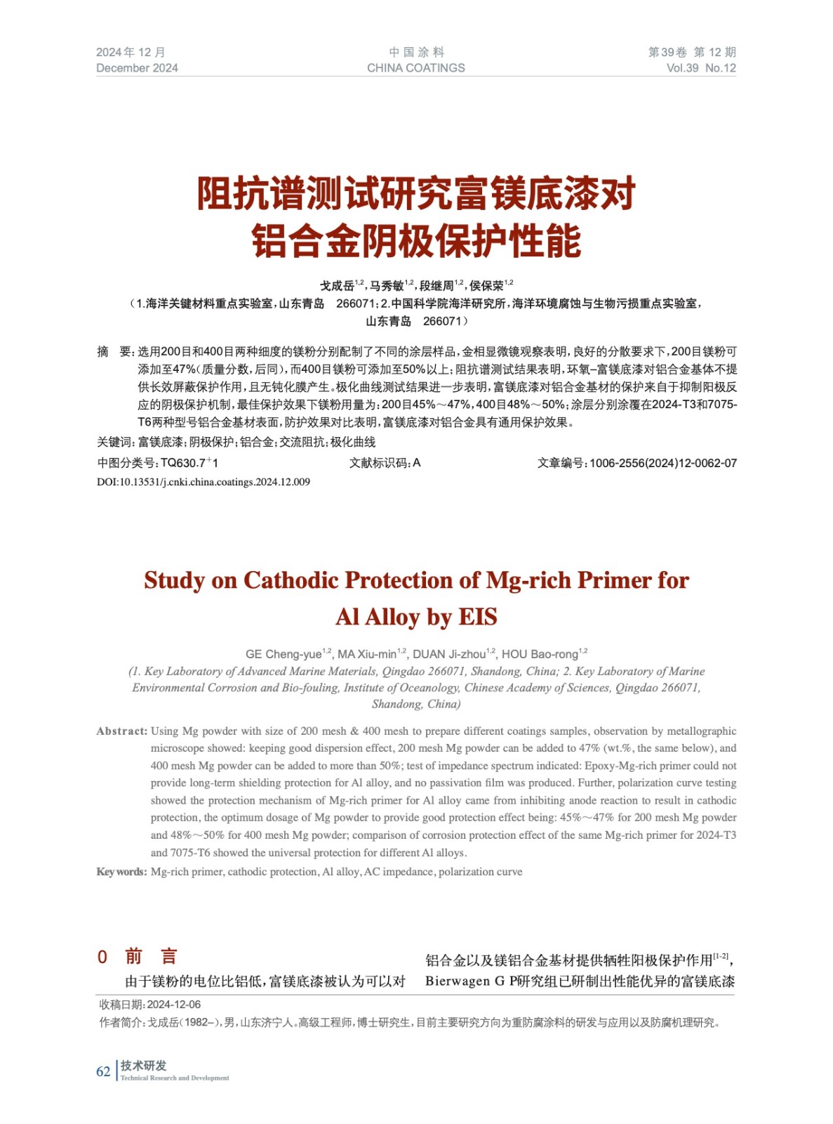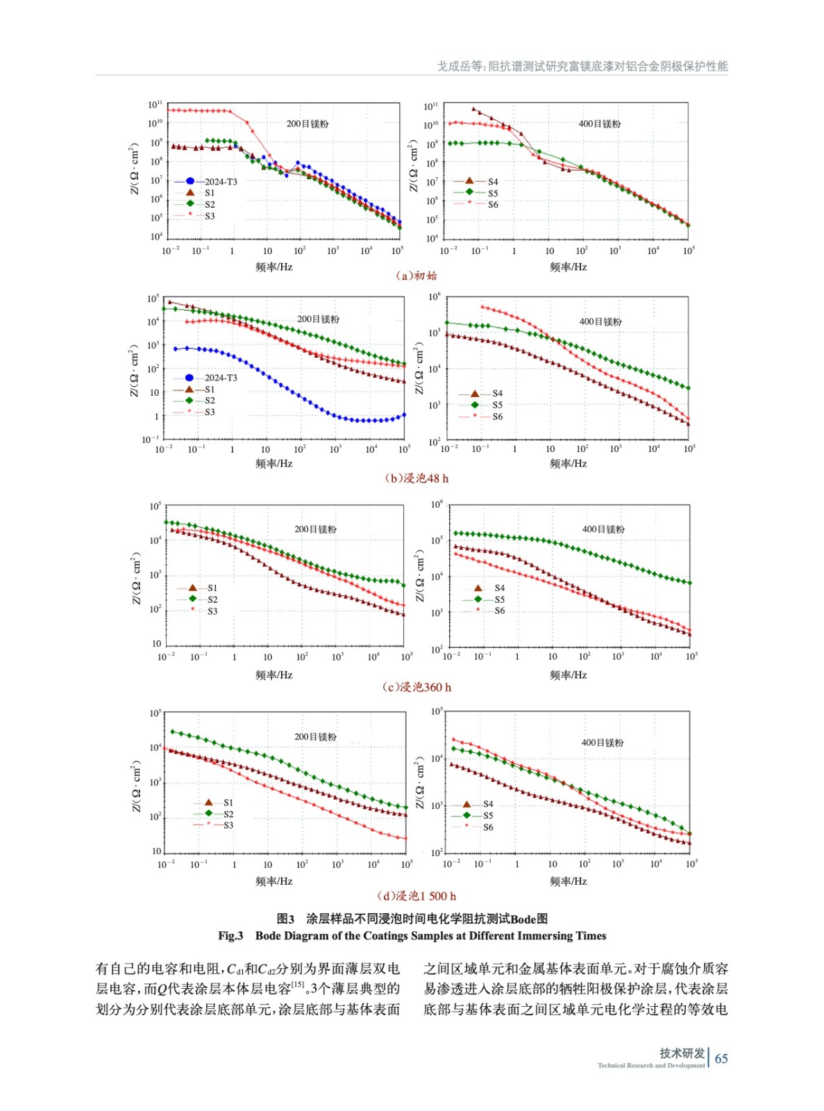 摘要:選用200目和400目兩種細度的鎂粉分別配制了不同的涂層樣品,金相顯微鏡觀察表明,良好的分散要求下,200目鎂粉可添加至47%(質量分數,后同),而400目鎂粉可添加至50%以上;阻抗譜測試結果表明,環氧–富鎂底漆對鋁合金基體不提供長效屏蔽保護作用,且無鈍化膜產生。極化曲線測試結果進一步表明,富鎂底漆對鋁合金基材的保護來自于抑制陽極反應的陰極保護機制,最佳保護效果下鎂粉用量為:200目45%~47%,400目48%~50%;涂層分別涂覆在2024-T3和7075-T6兩種型號鋁合金基材表面,防護效果對比表明,富鎂底漆對鋁合金具有通用保護效果。