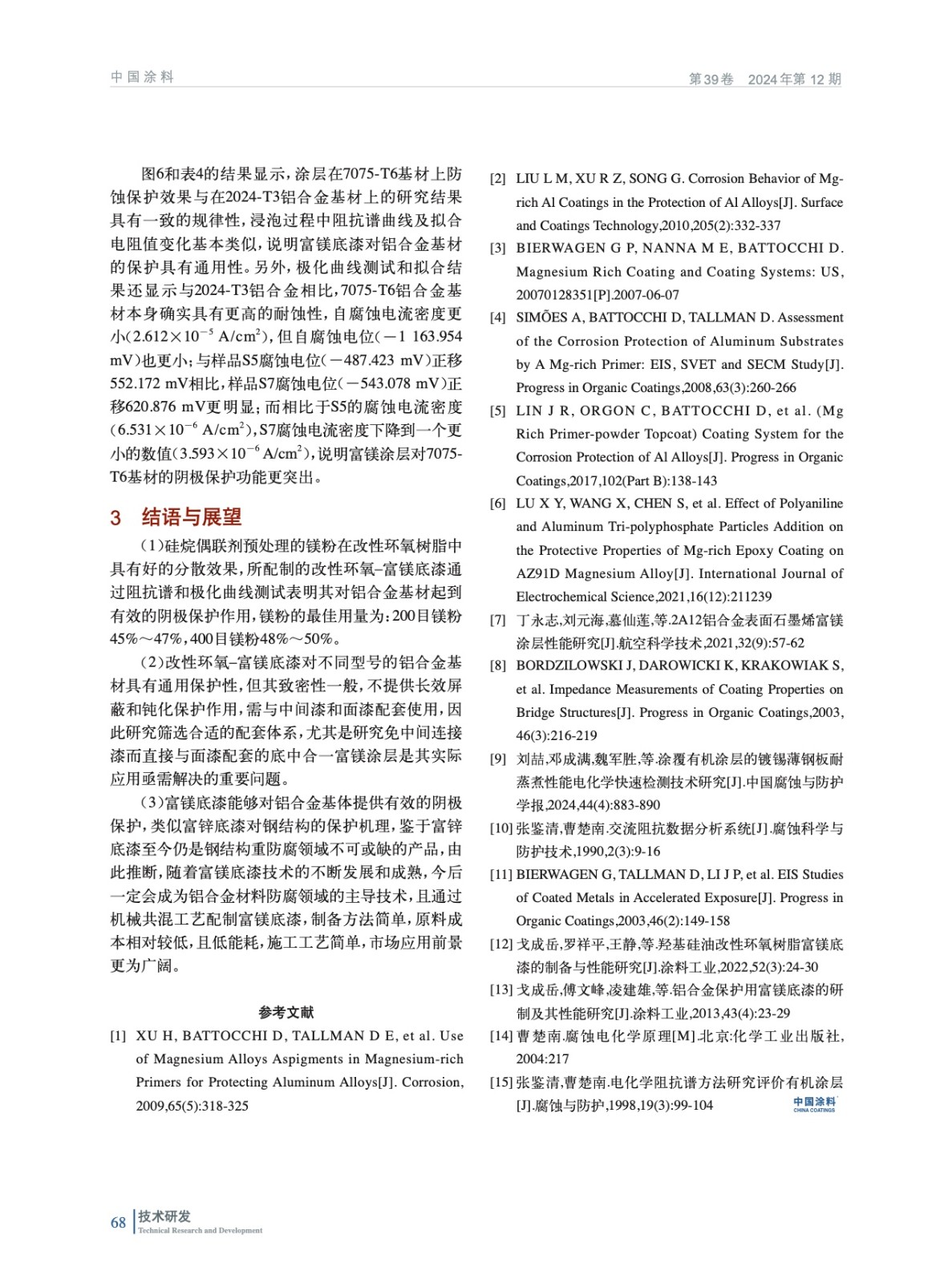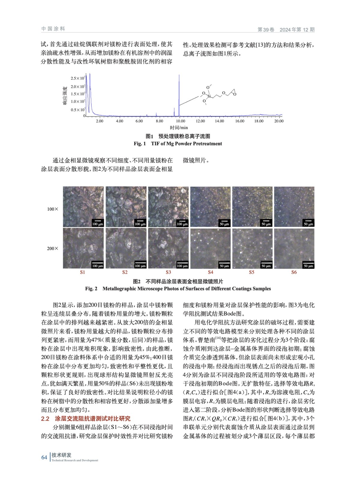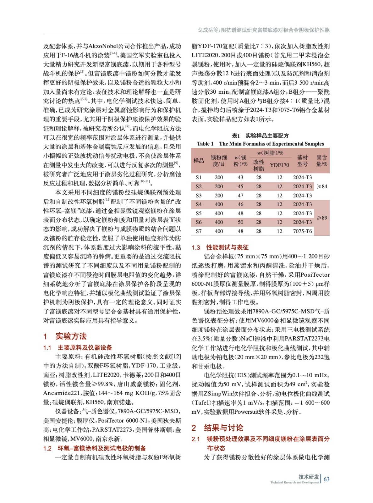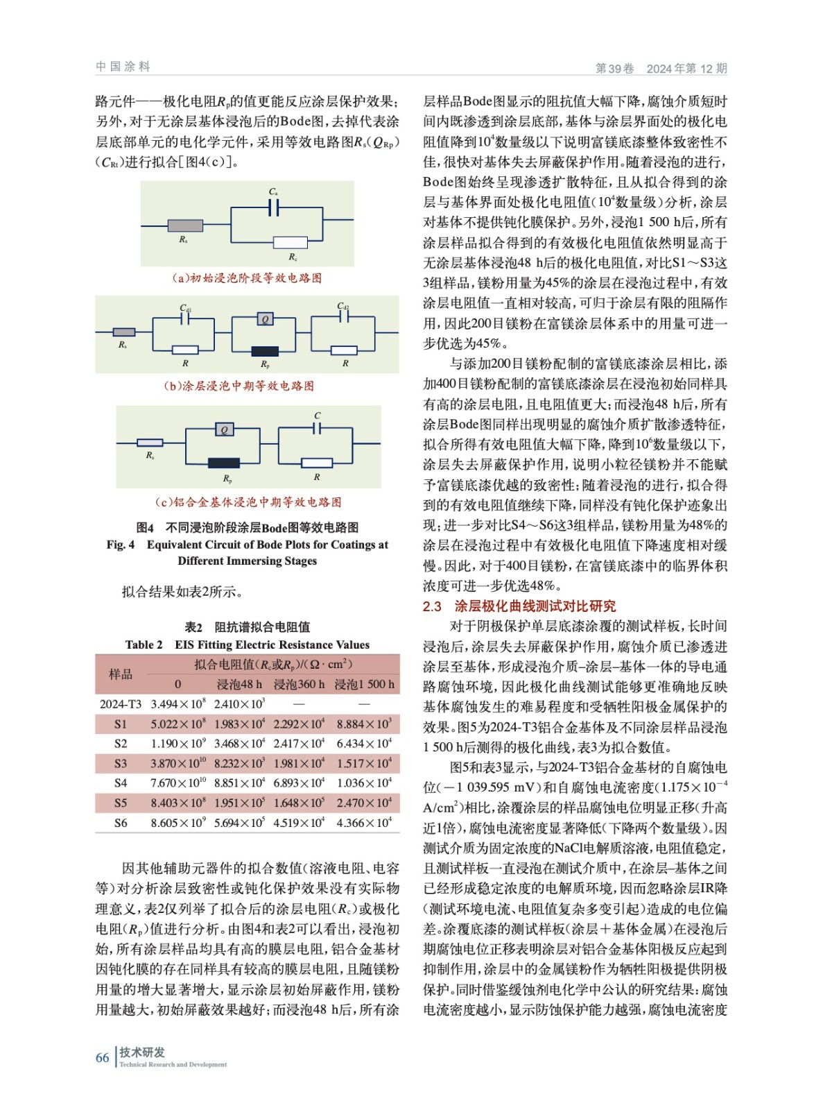 摘要:選用200目和400目兩種細度的鎂粉分別配制了不同的涂層樣品,金相顯微鏡觀察表明,良好的分散要求下,200目鎂粉可添加至47%(質量分數,后同),而400目鎂粉可添加至50%以上;阻抗譜測試結果表明,環氧–富鎂底漆對鋁合金基體不提供長效屏蔽保護作用,且無鈍化膜產生。極化曲線測試結果進一步表明,富鎂底漆對鋁合金基材的保護來自于抑制陽極反應的陰極保護機制,最佳保護效果下鎂粉用量為:200目45%~47%,400目48%~50%;涂層分別涂覆在2024-T3和7075-T6兩種型號鋁合金基材表面,防護效果對比表明,富鎂底漆對鋁合金具有通用保護效果。