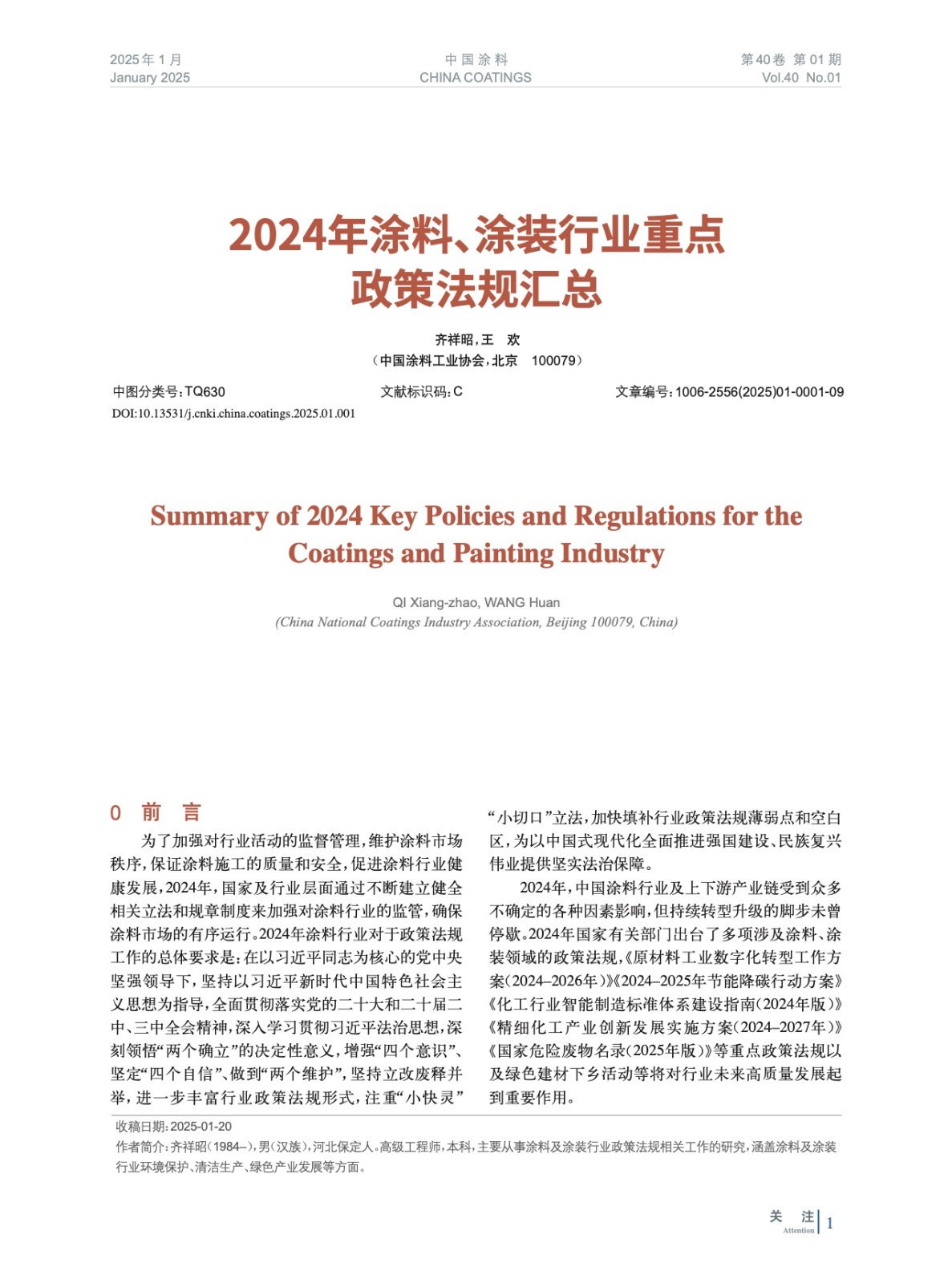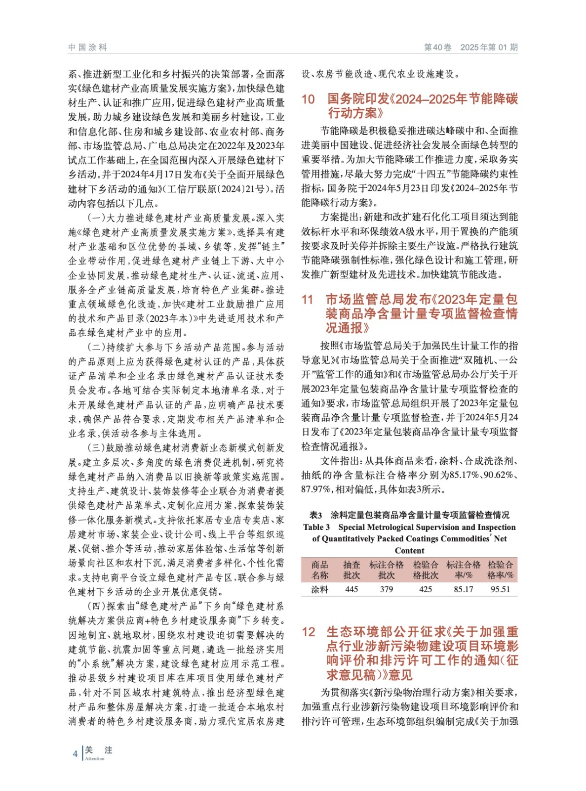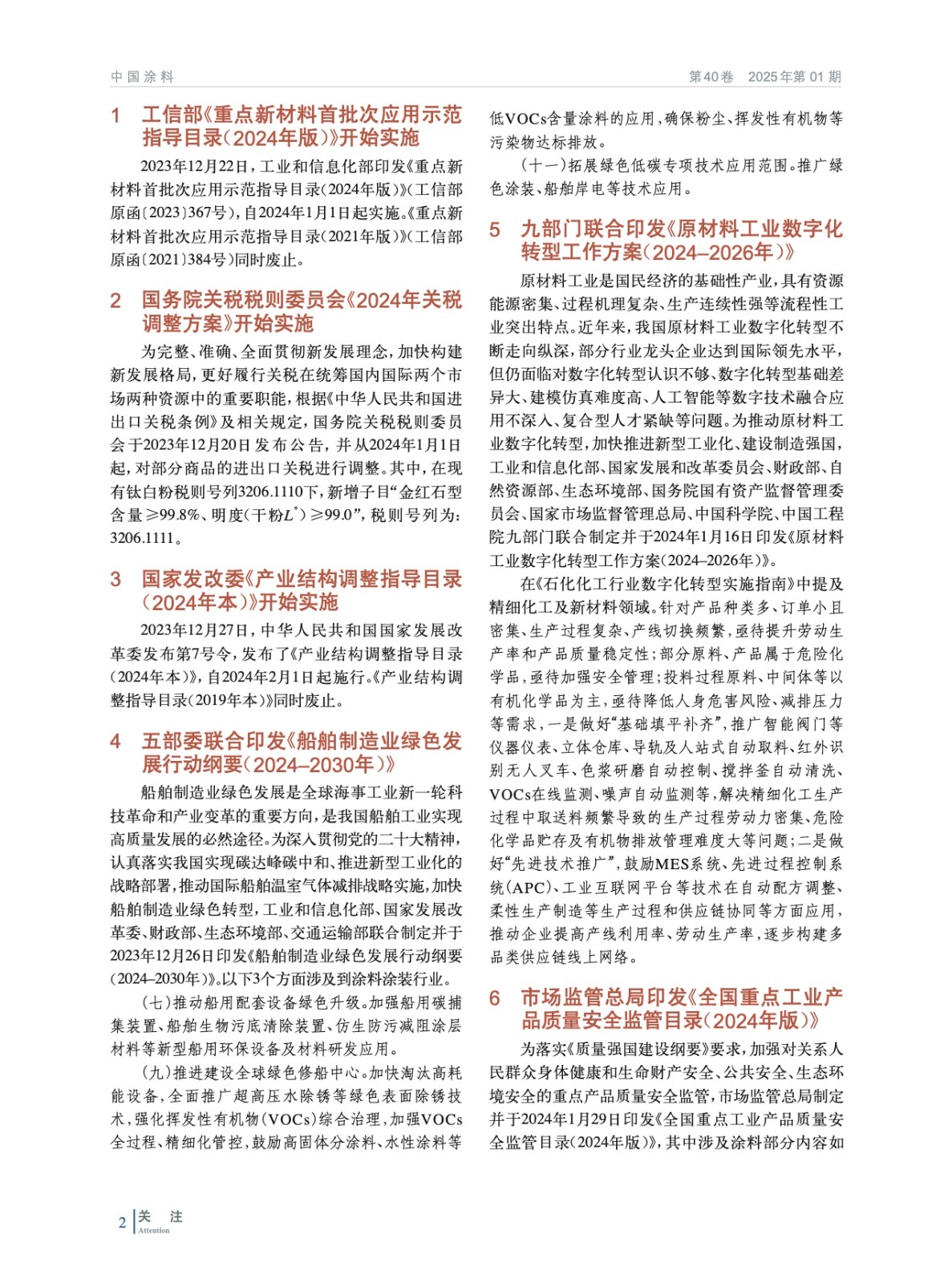 摘要:編者按:2024年,中國(guó)涂料行業(yè)及上下游產(chǎn)業(yè)鏈?zhǔn)艿奖姸嗖淮_定的各種因素影響,但持續(xù)轉(zhuǎn)型升級(jí)的腳步未曾停歇。2024年國(guó)家有關(guān)部門(mén)出臺(tái)了多項(xiàng)涉及涂料、涂裝領(lǐng)域的政策法規(guī),《原材料工業(yè)數(shù)字化轉(zhuǎn)型工作方案(2024–2026年)》《2024–2025年節(jié)能降碳行動(dòng)方案》《化工行業(yè)智能制造標(biāo)準(zhǔn)體系建設(shè)指南(2024年版)》《精細(xì)化工產(chǎn)業(yè)創(chuàng)新發(fā)展實(shí)施方案(2024–2027年)》《國(guó)家危險(xiǎn)廢物名錄(2025年版)》等重點(diǎn)政策法規(guī)以及綠色建材下鄉(xiāng)活動(dòng)等將對(duì)行業(yè)未來(lái)高質(zhì)量發(fā)展起到重要作用。