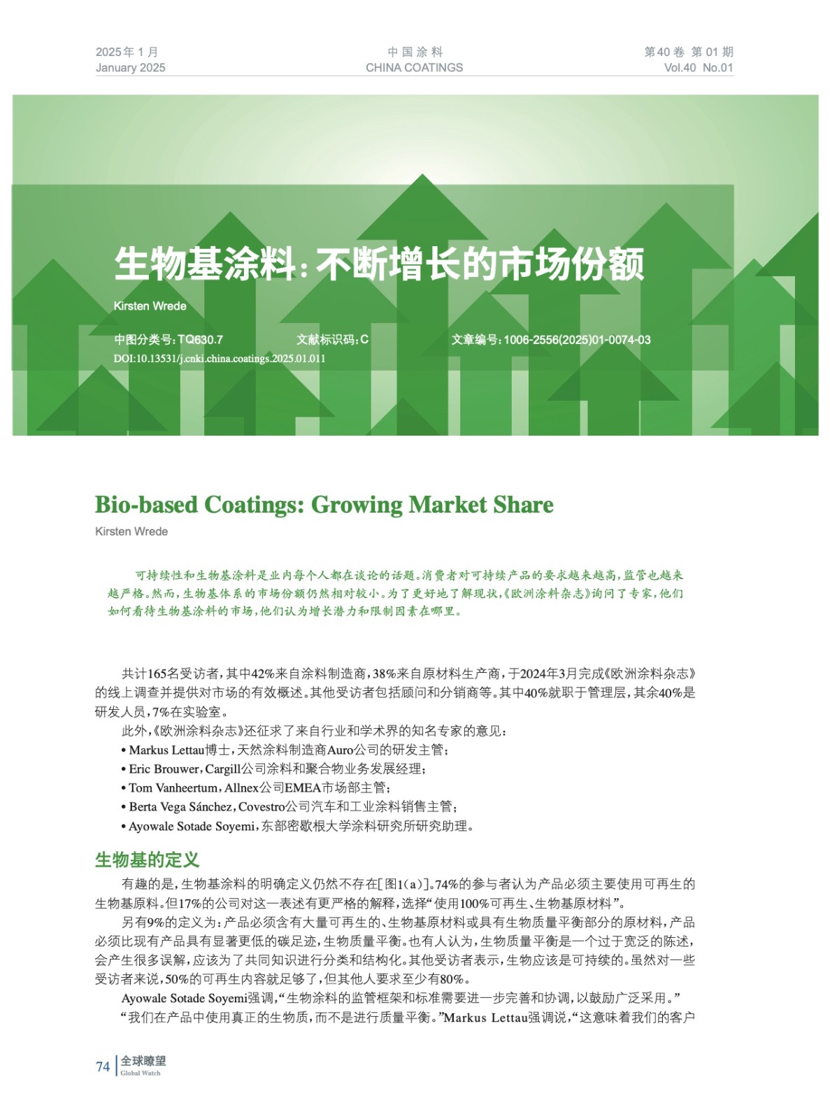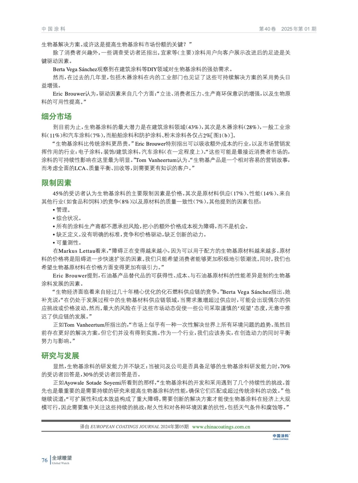 摘要:編者按:可持續(xù)性和生物基涂料是業(yè)內(nèi)每個(gè)人都在談?wù)摰脑掝}。消費(fèi)者對(duì)可持續(xù)產(chǎn)品的要求越來(lái)越高,監(jiān)管也越來(lái)越嚴(yán)格。然而,生物基體系的市場(chǎng)份額仍然相對(duì)較小。為了更好地了解現(xiàn)狀,《歐洲涂料雜志》詢問(wèn)了專(zhuān)家,他們?nèi)绾慰创锘苛系氖袌?chǎng),他們認(rèn)為增長(zhǎng)潛力和限制因素在哪里。