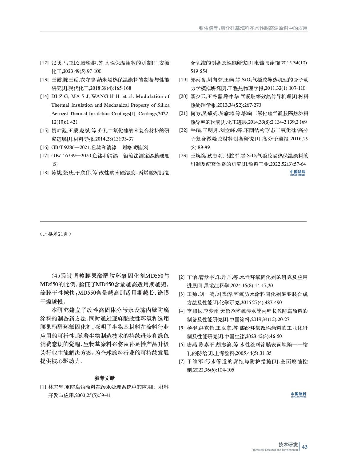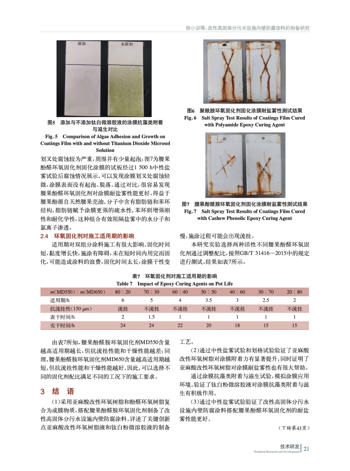 摘要:采用亞麻酸改性環氧樹脂和酚醛環氧樹脂復合為成膜物質,搭配腰果酚醛胺環氧固化劑制備了改性高固體分污水設施內壁防腐涂料,并詳述了關鍵創新點亞麻酸改性環氧樹脂液和鈦白粉微溶膠液的制備工藝。驗證了亞麻酸改性環氧樹脂可以提升涂膜附著力;驗證了鈦白粉微溶膠液對涂膜抗藻類附著與滋生有積極作用;驗證了改性高固體分污水設施內壁防腐涂料搭配腰果酚醛胺環氧固化劑,涂膜耐鹽霧性能更好;探討了適合不同施工工況下適用期的腰果酚醛胺環氧固化劑MD550與MD650的比例。