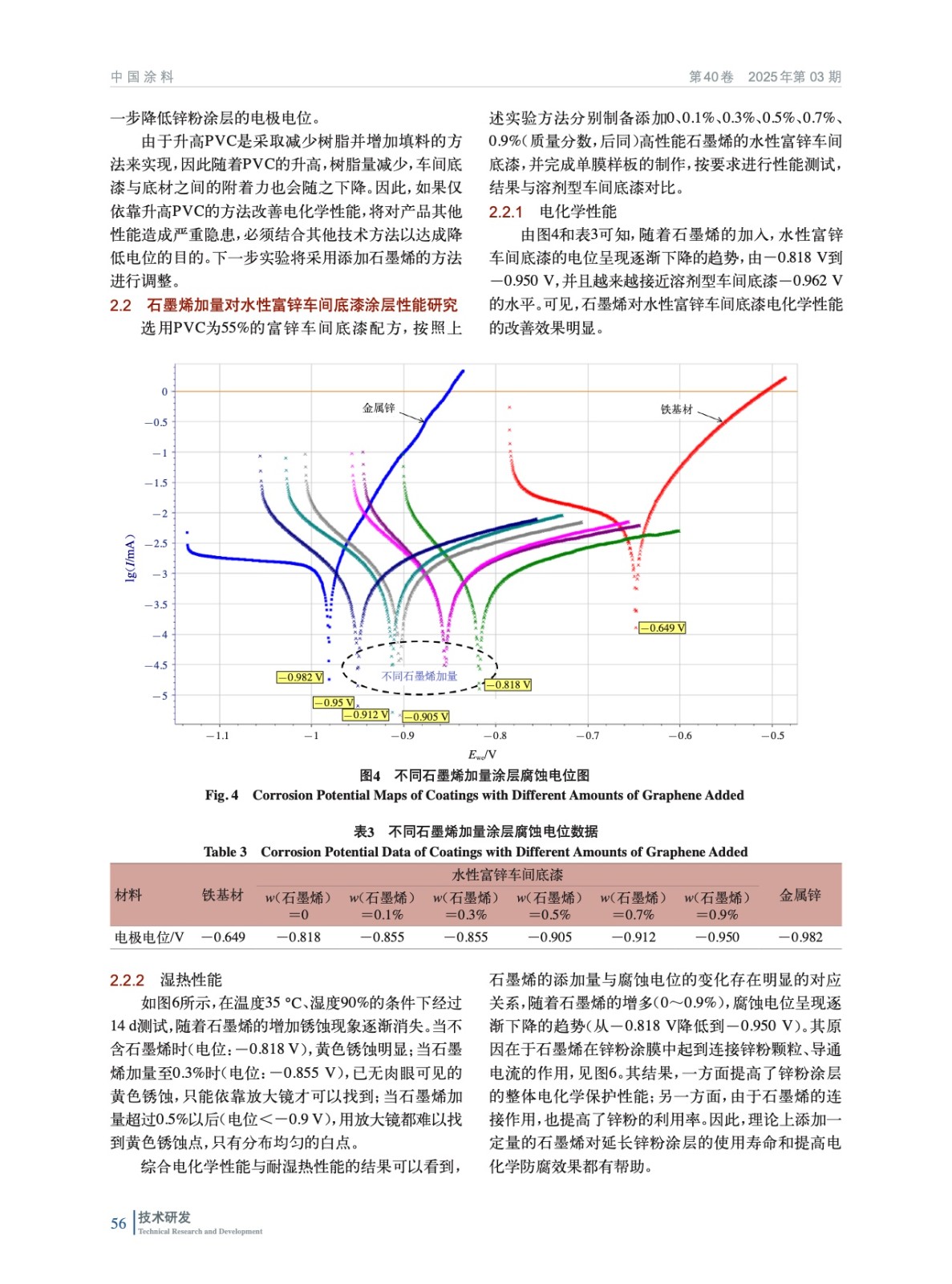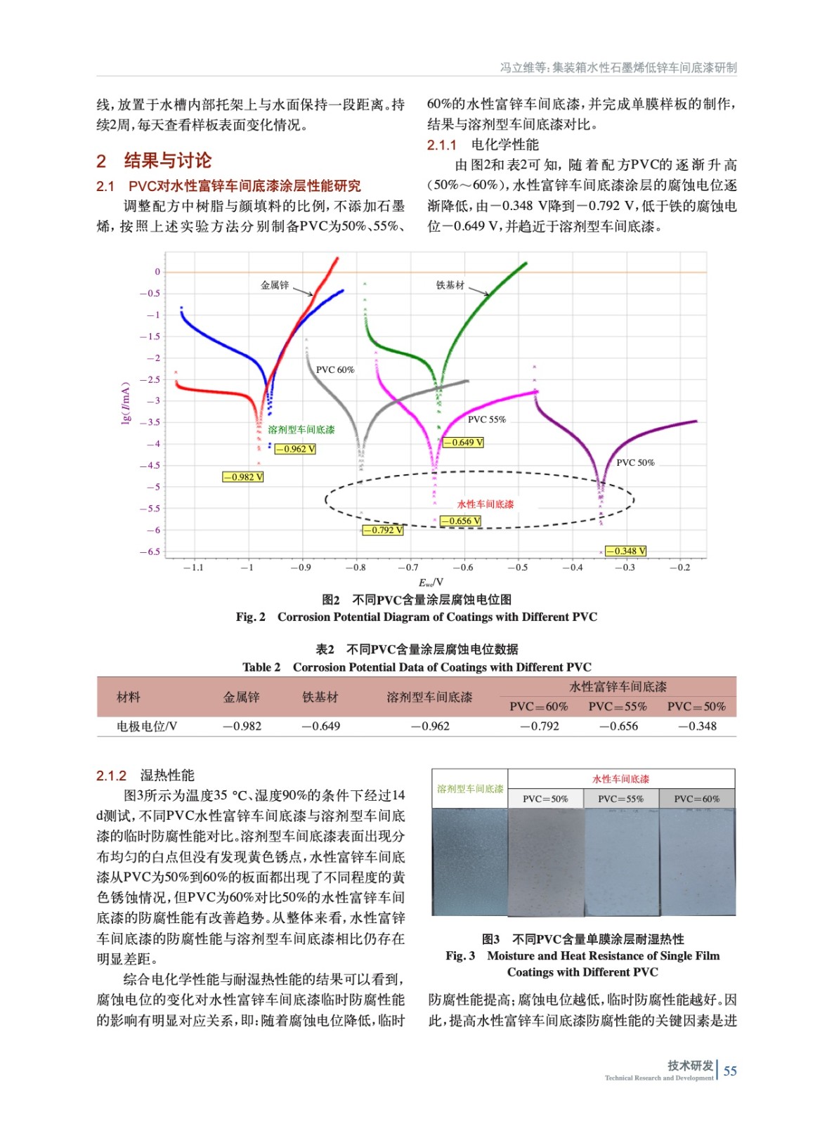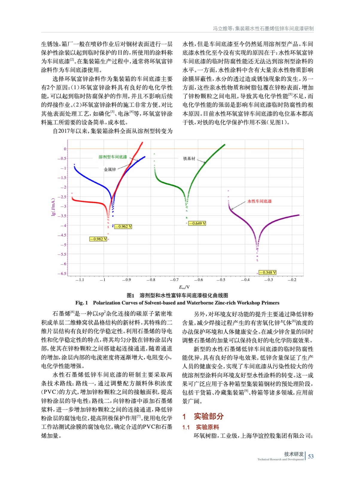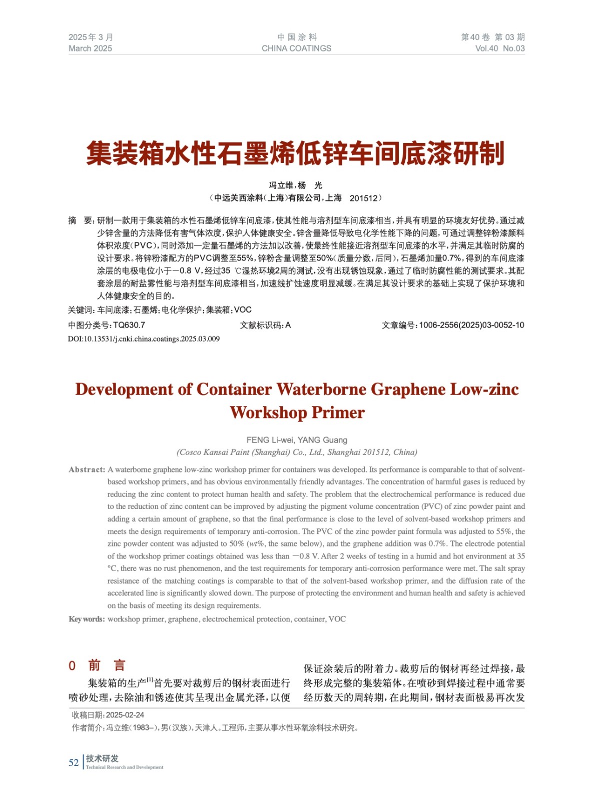 摘要:研制一款用于集裝箱的水性石墨烯低鋅車間底漆,使其性能與溶劑型車間底漆相當,并具有明顯的環(huán)境友好優(yōu)勢。通過減少鋅含量的方法降低有害氣體濃度,保護人體健康安全。鋅含量降低導致電化學性能下降的問題,可通過調整鋅粉漆顏料體積濃度(PVC),同時添加一定量石墨烯的方法加以改善,使最終性能接近溶劑型車間底漆的水平,并滿足其臨時防腐的設計要求。將鋅粉漆配方的PVC調整至55%,鋅粉含量調整至50%(質量分數(shù),后同),石墨烯加量0.7%,得到的車間底漆涂層的電極電位小于-0.8 V,經過35 ℃濕熱環(huán)境2周的測試,沒有出現(xiàn)銹蝕現(xiàn)象,通過了臨時防腐性能的測試要求。其配套涂層的耐鹽霧性能與溶劑型車間底漆相當,加速線擴蝕速度明顯減緩。在滿足其設計要求的基礎上實現(xiàn)了保護環(huán)境和人體健康安全的目的。