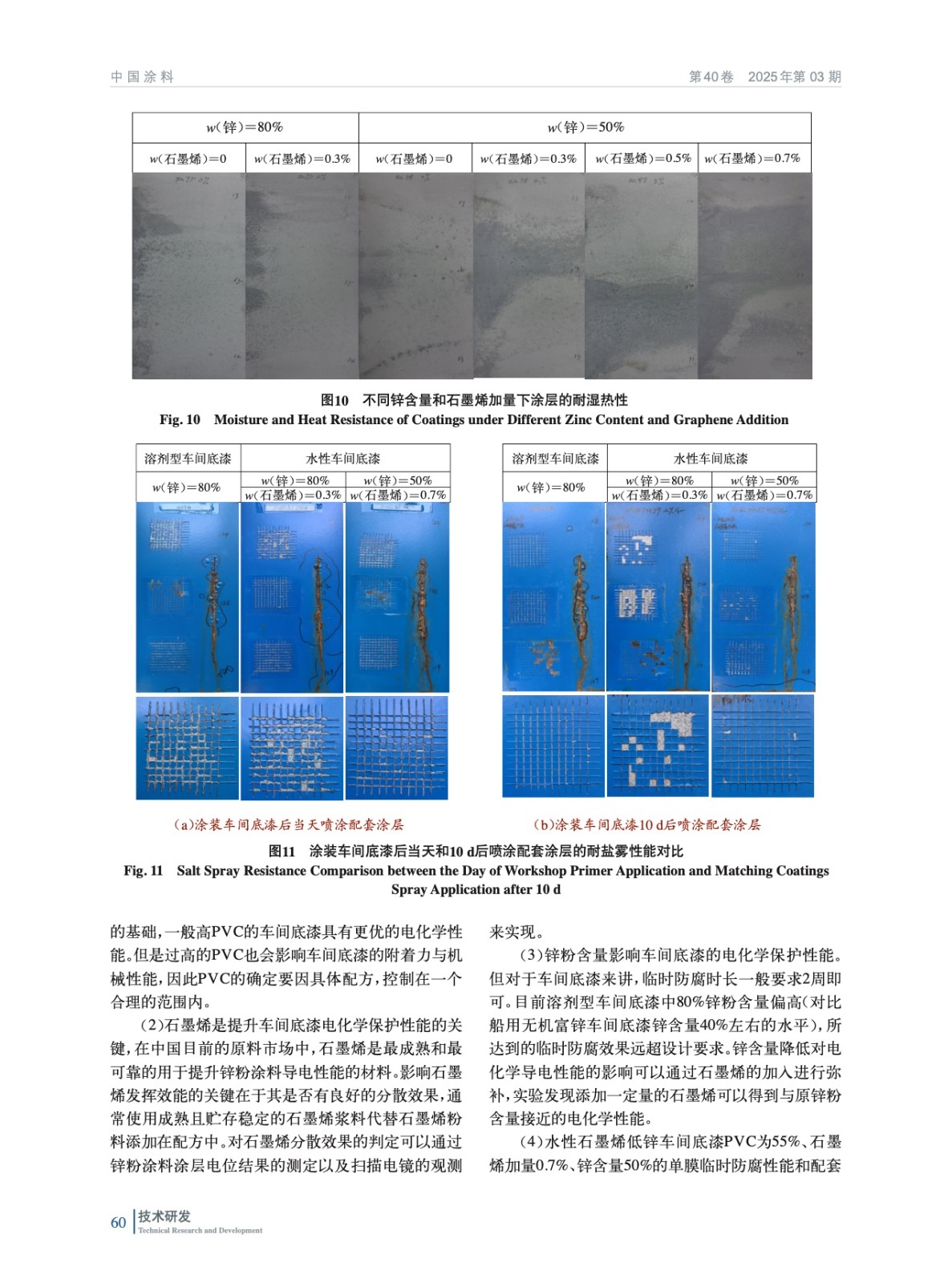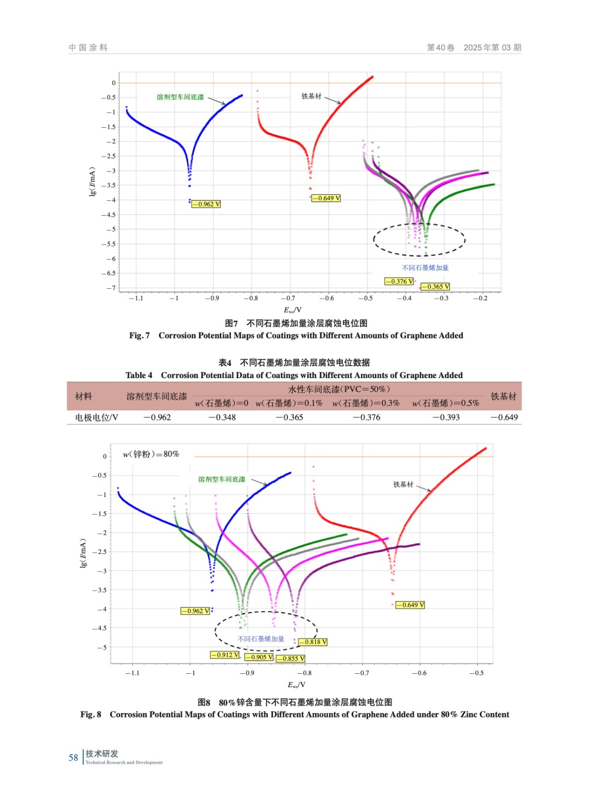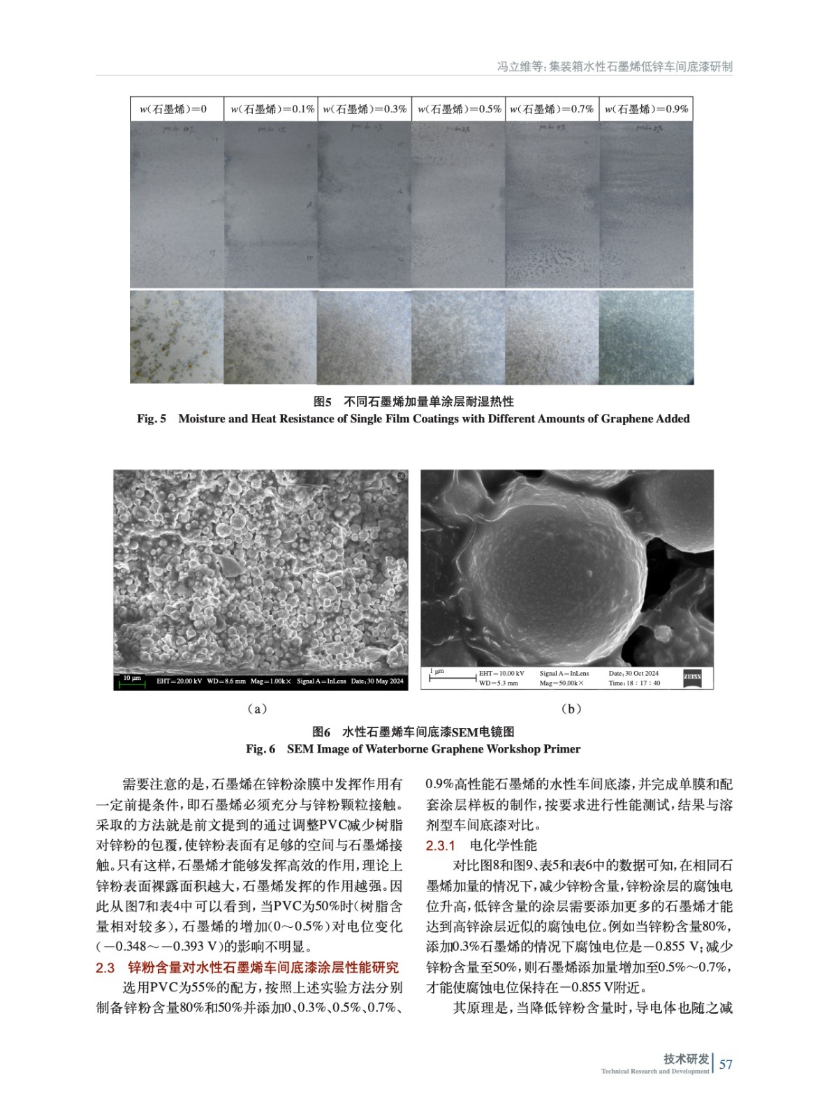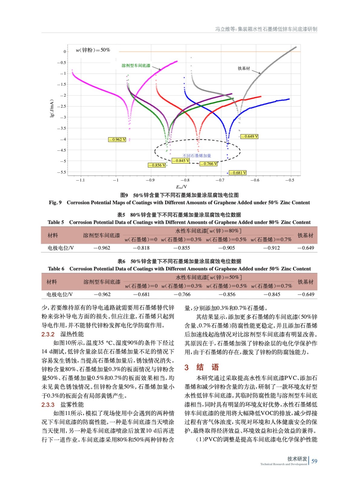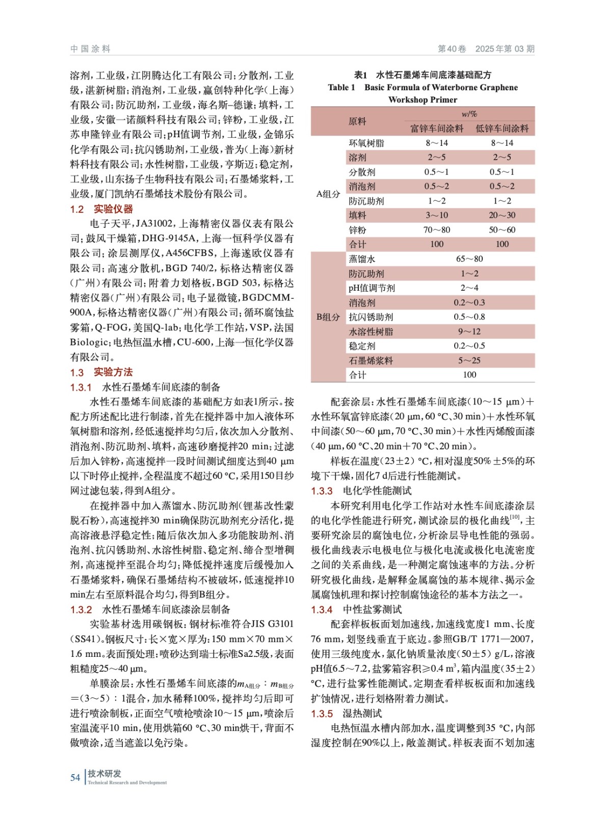 摘要:研制一款用于集裝箱的水性石墨烯低鋅車間底漆,使其性能與溶劑型車間底漆相當,并具有明顯的環(huán)境友好優(yōu)勢。通過減少鋅含量的方法降低有害氣體濃度,保護人體健康安全。鋅含量降低導致電化學性能下降的問題,可通過調整鋅粉漆顏料體積濃度(PVC),同時添加一定量石墨烯的方法加以改善,使最終性能接近溶劑型車間底漆的水平,并滿足其臨時防腐的設計要求。將鋅粉漆配方的PVC調整至55%,鋅粉含量調整至50%(質量分數(shù),后同),石墨烯加量0.7%,得到的車間底漆涂層的電極電位小于-0.8 V,經過35 ℃濕熱環(huán)境2周的測試,沒有出現(xiàn)銹蝕現(xiàn)象,通過了臨時防腐性能的測試要求。其配套涂層的耐鹽霧性能與溶劑型車間底漆相當,加速線擴蝕速度明顯減緩。在滿足其設計要求的基礎上實現(xiàn)了保護環(huán)境和人體健康安全的目的。