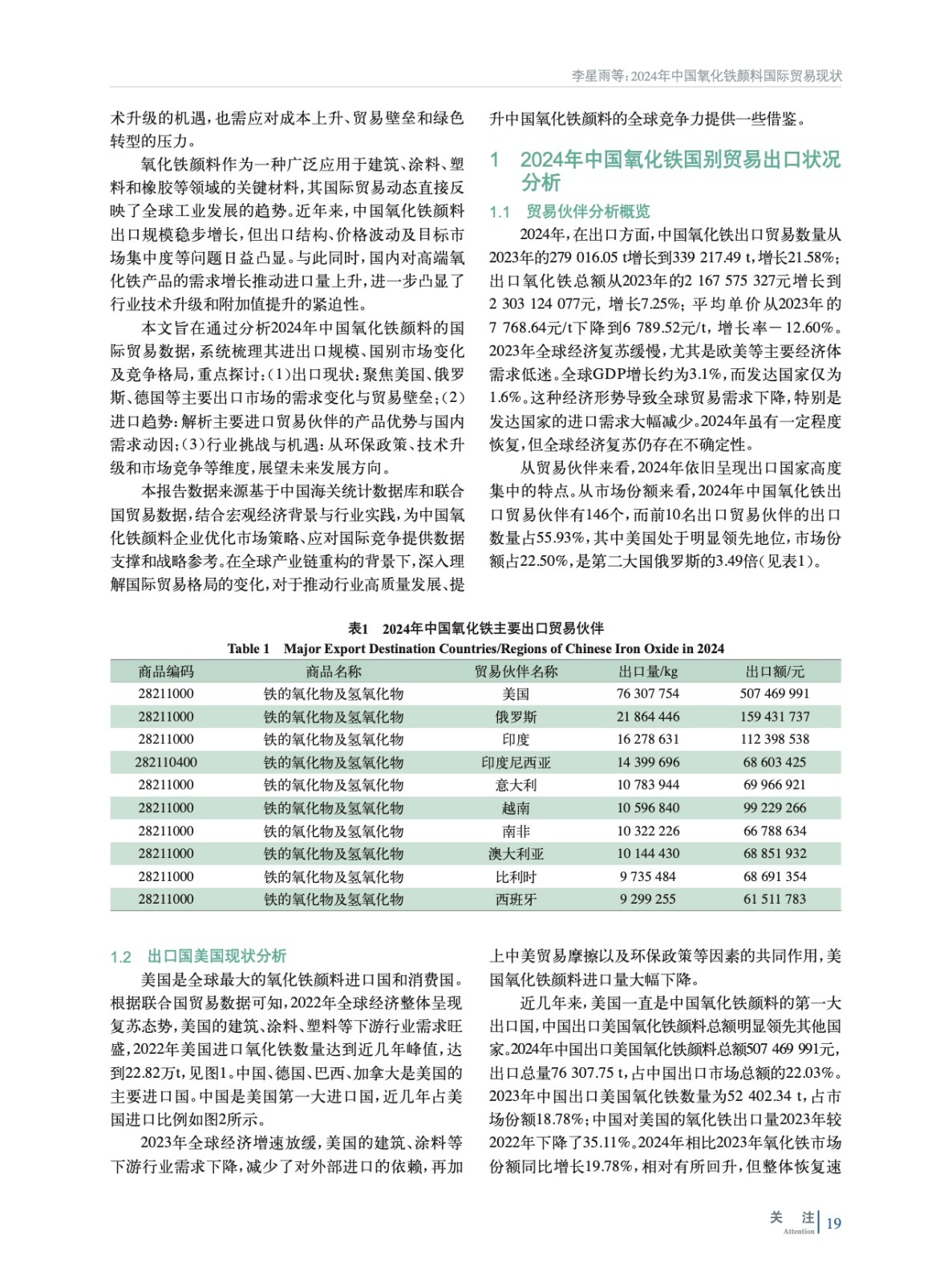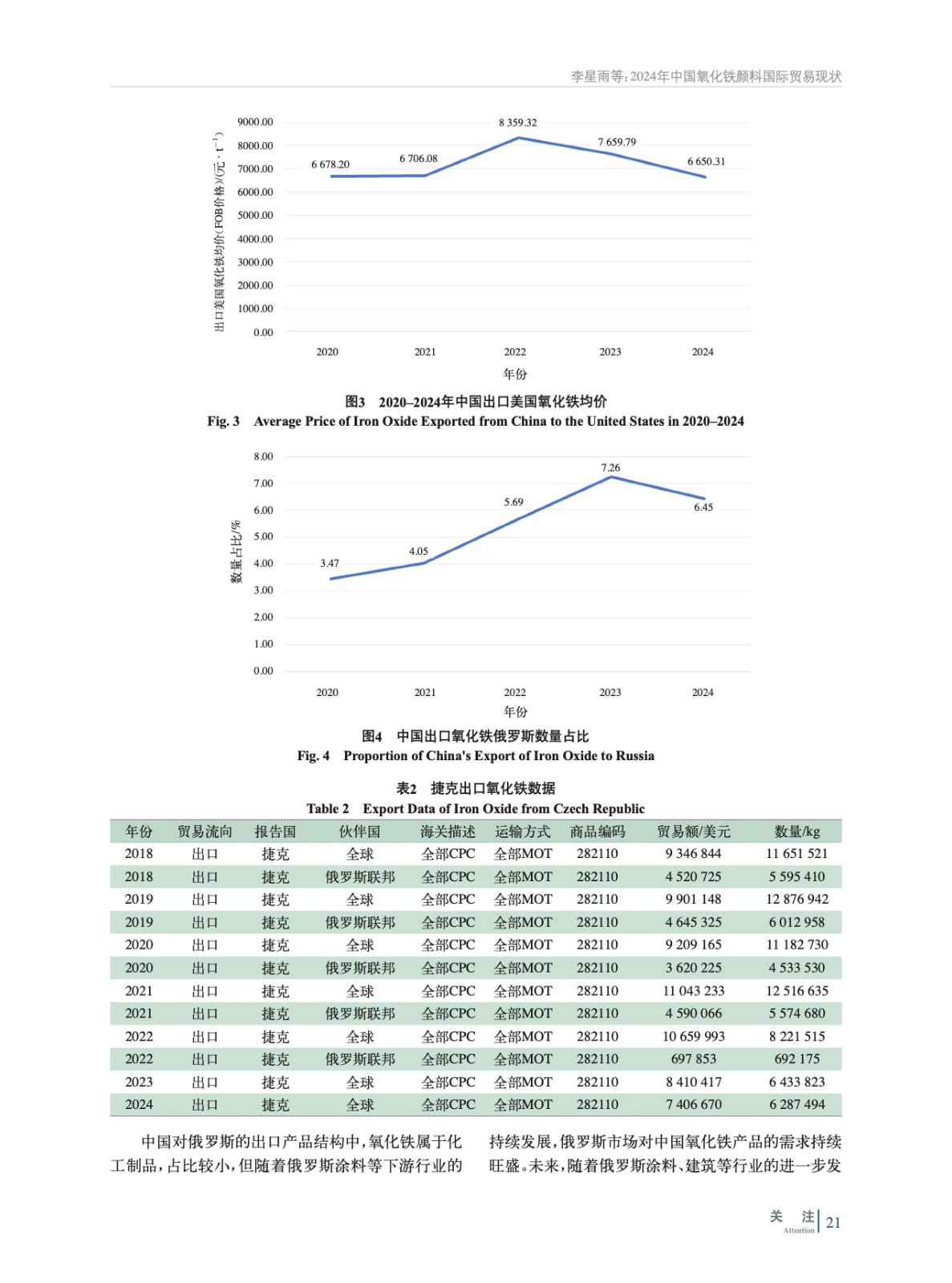 摘要:基于中國海關(guān)統(tǒng)計(jì)數(shù)據(jù)庫、聯(lián)合國商品貿(mào)易統(tǒng)計(jì)數(shù)據(jù)庫等數(shù)據(jù),對(duì)中國氧化鐵顏料近幾年貿(mào)易現(xiàn)狀進(jìn)行研究分析,詳細(xì)梳理了2024年中國氧化鐵顏料進(jìn)出口規(guī)模,進(jìn)出口貿(mào)易伙伴的發(fā)展變化,尤其就主要出口貿(mào)易伙伴——美國、俄羅斯、德國以及主要進(jìn)口貿(mào)易伙伴的發(fā)展趨勢(shì)與波動(dòng)進(jìn)行重點(diǎn)剖析與比較,旨在為中國氧化鐵顏料的供給和需求企業(yè)提供更多的參考依據(jù)與行業(yè)觀察。