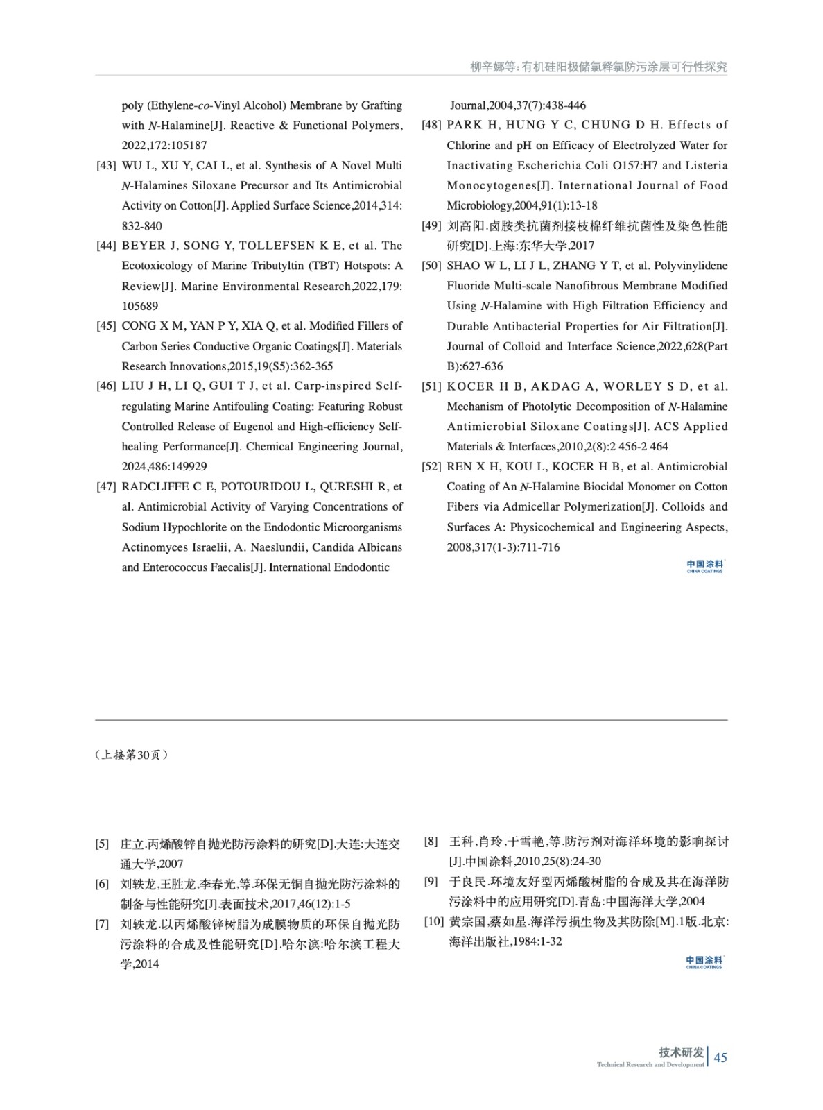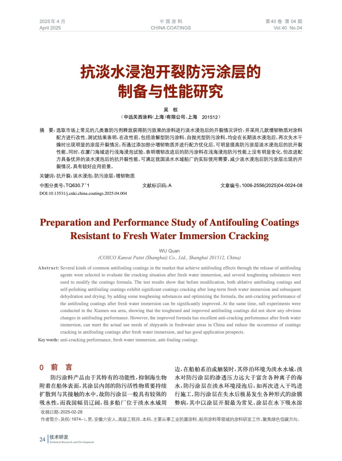 摘要:選取市場上常見的幾類靠防污劑釋放獲得防污效果的涂料進行淡水浸泡后的開裂情況評價,并采用幾款增韌物質對涂料配方進行改性。測試結果表明,在改性前,包括溶解型防污涂料、自拋光型防污涂料,均會在長期淡水浸泡后,再次失水干燥時出現明顯的涂層開裂情況;而通過添加部分增韌物質并進行配方優化后,可明顯提高防污涂層淡水浸泡后的抗開裂性能。同時,在廈門海域進行淺海浸泡試驗,表明增韌改進后的防污涂料在淺海浸泡防污性能上沒有明顯變化,但改進配方具備優異的淡水浸泡后的抗開裂性能,可滿足我國淡水水域船廠的實際使用需要,減少淡水浸泡后防污涂層出現的開裂情況,具有較好應用前景。
