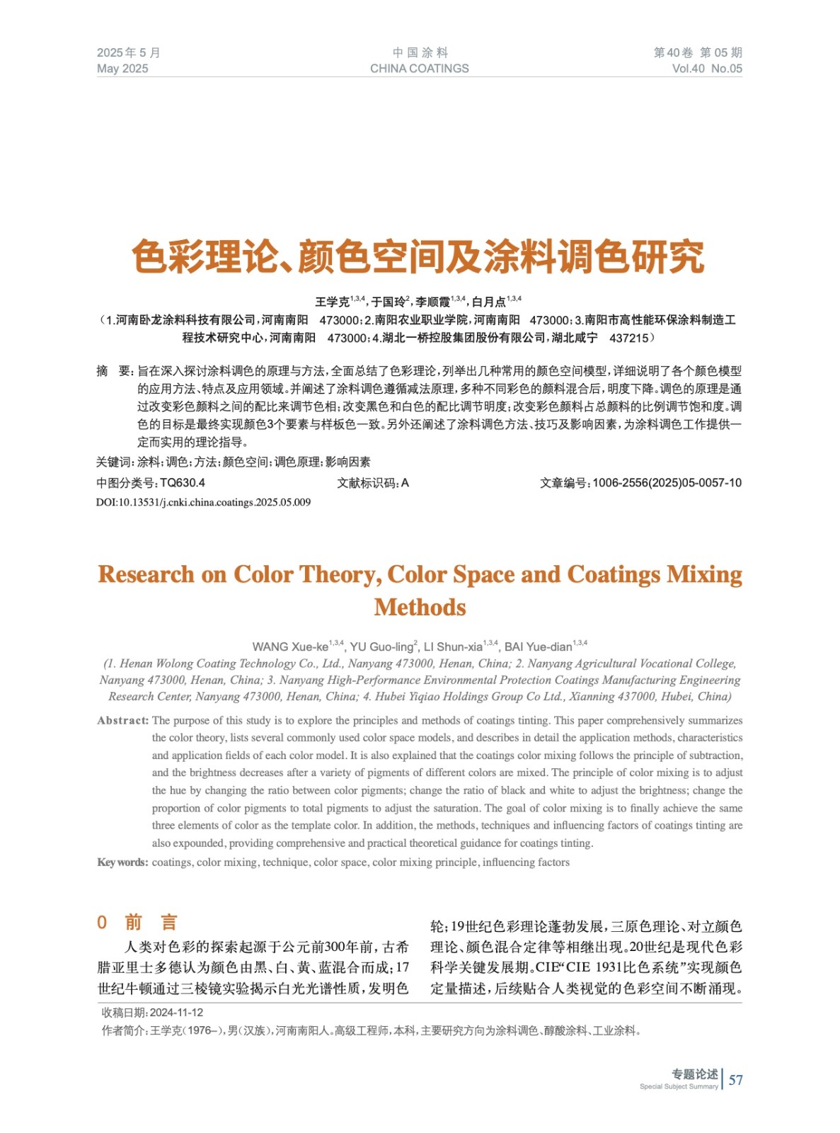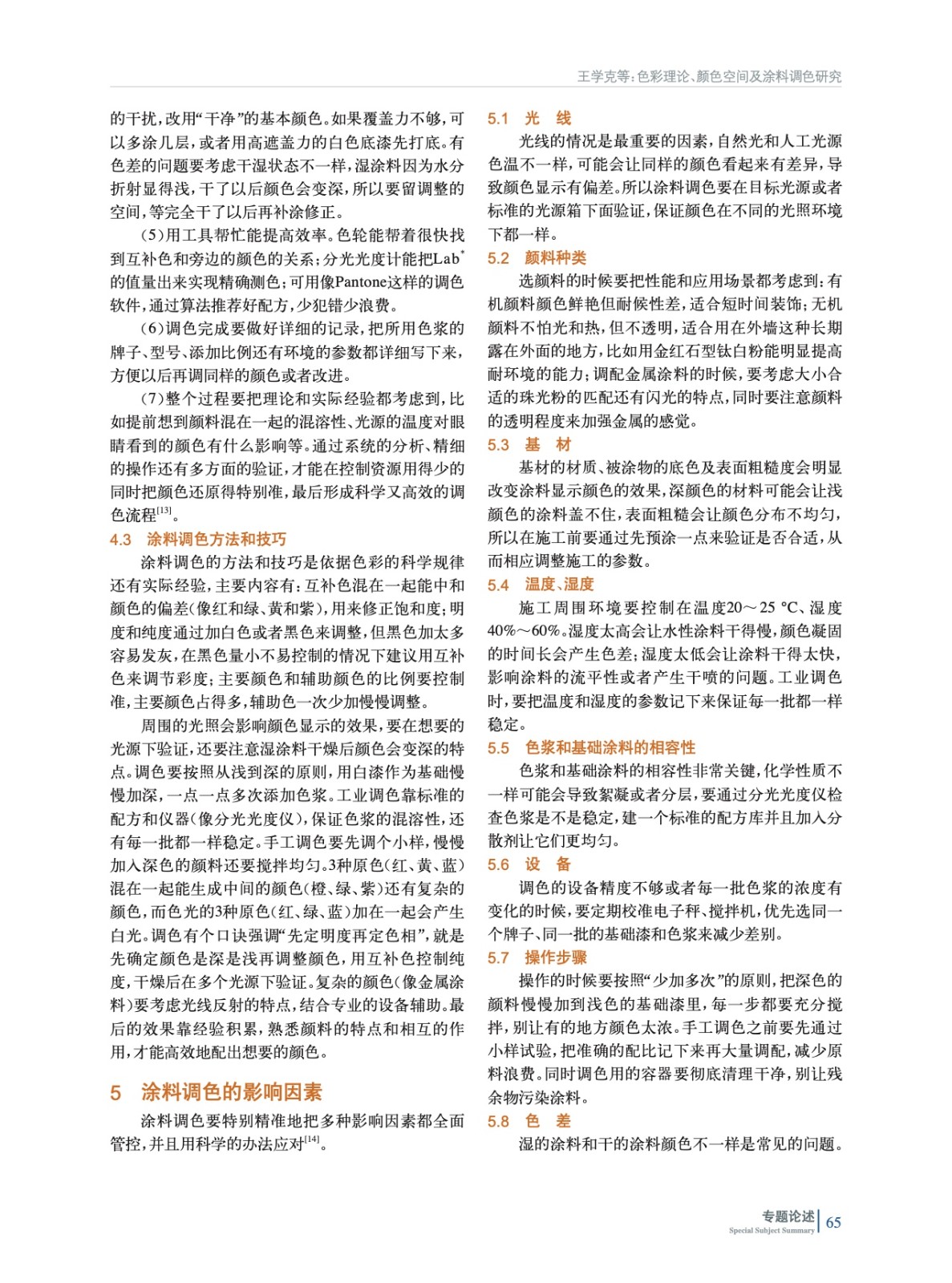 摘要:旨在深入探討涂料調色的原理與方法,全面總結了色彩理論,列舉出幾種常用的顏色空間模型,詳細說明了各個顏色模型的應用方法、特點及應用領域。并闡述了涂料調色遵循減法原理,多種不同彩色的顏料混合后,明度下降。調色的原理是通過改變彩色顏料之間的配比來調節色相;改變黑色和白色的配比調節明度;改變彩色顏料占總顏料的比例調節飽和度。調色的目標是最終實現顏色3個要素與樣板色一致。另外還闡述了涂料調色方法、技巧及影響因素,為涂料調色工作提供一定而實用的理論指導。