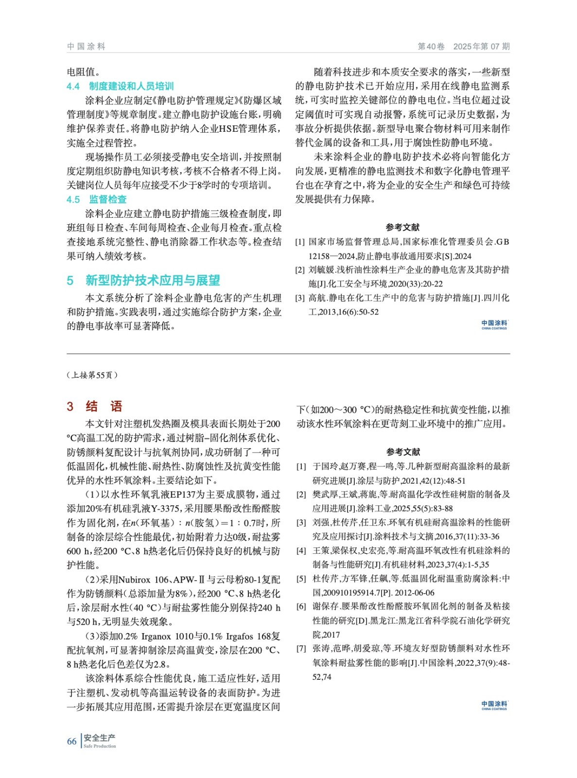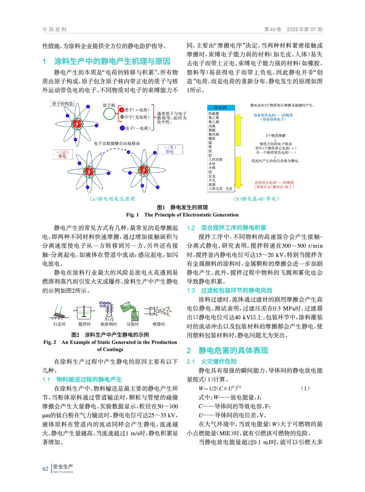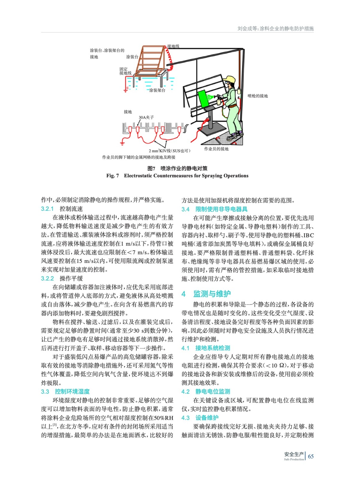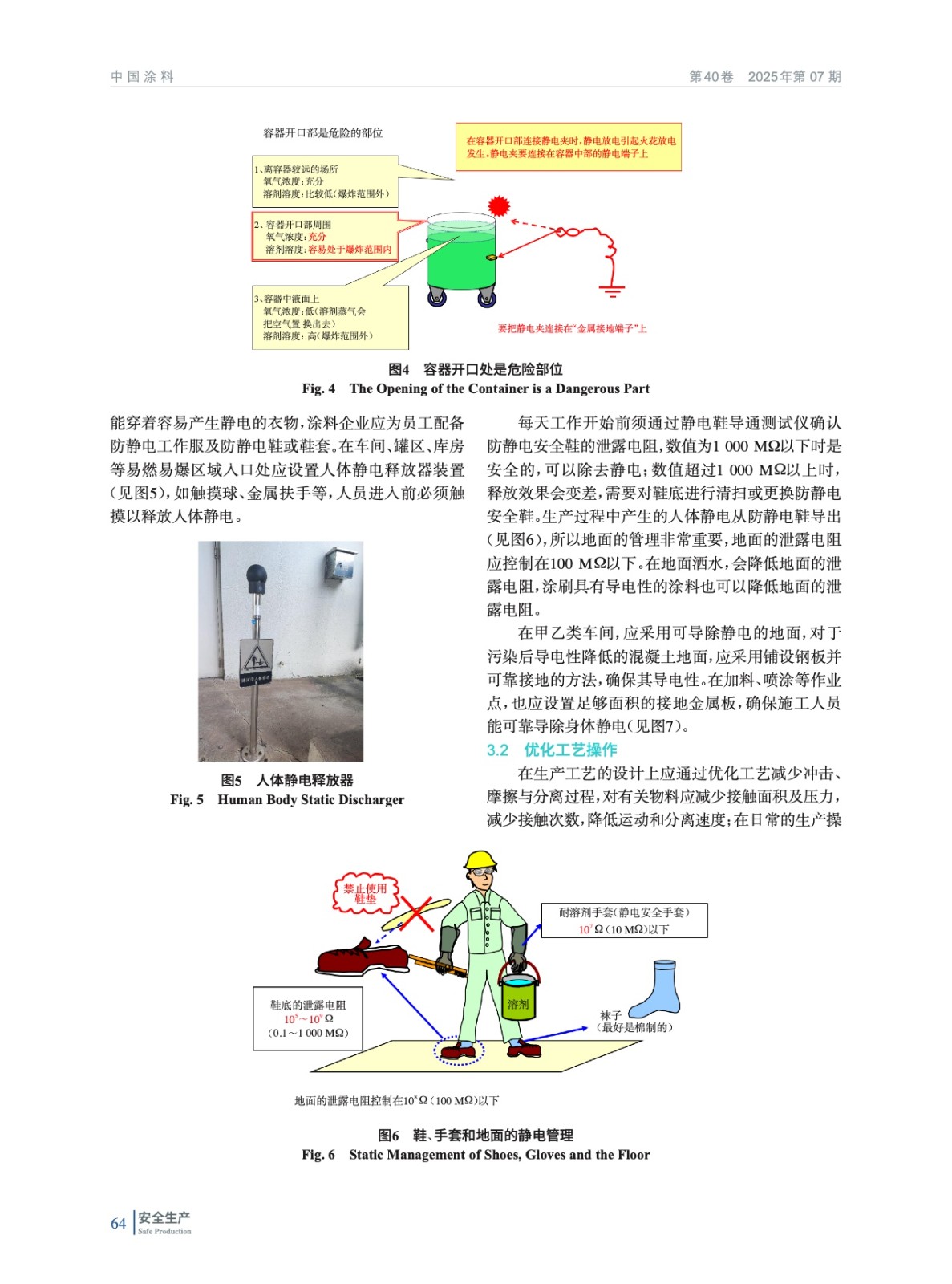 通過分析涂料生產各環節的靜電產生機理及安全事故危害,研究提出了包括工藝控制、設備接地、環境增濕、人員防護等在內的綜合靜電防護措施,并建立了相應的安全管理體系。實踐表明,實施這些措施可顯著降低涂料企業的靜電危害風險。