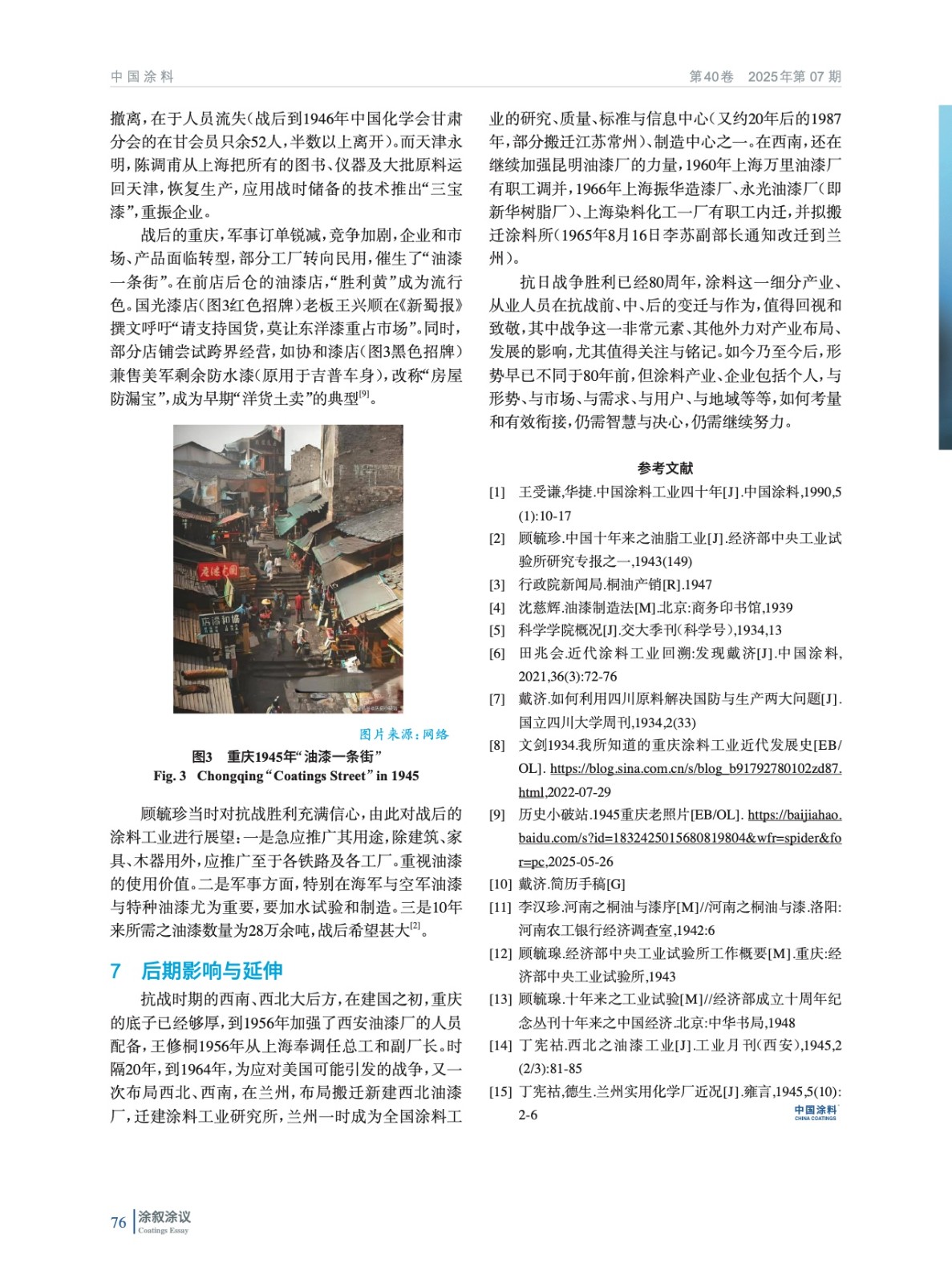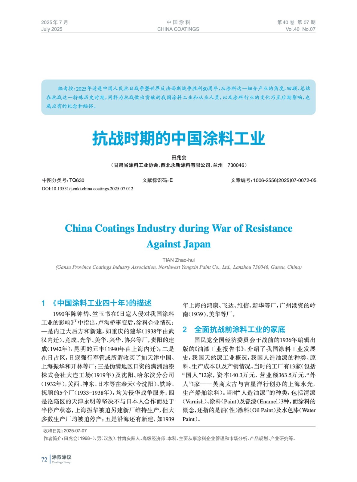 摘要:2025年適逢中國人民抗日戰(zhàn)爭暨世界反法西斯戰(zhàn)爭勝利80周年,從涂料這一細分產(chǎn)業(yè)的角度,回顧、總結在抗戰(zhàn)這一特殊歷史時期,同樣為抗戰(zhàn)做出貢獻的我國涂料工業(yè)和從業(yè)人員,以及涂料行業(yè)的變化乃至后期影響,也屬應有的紀念和緬懷。