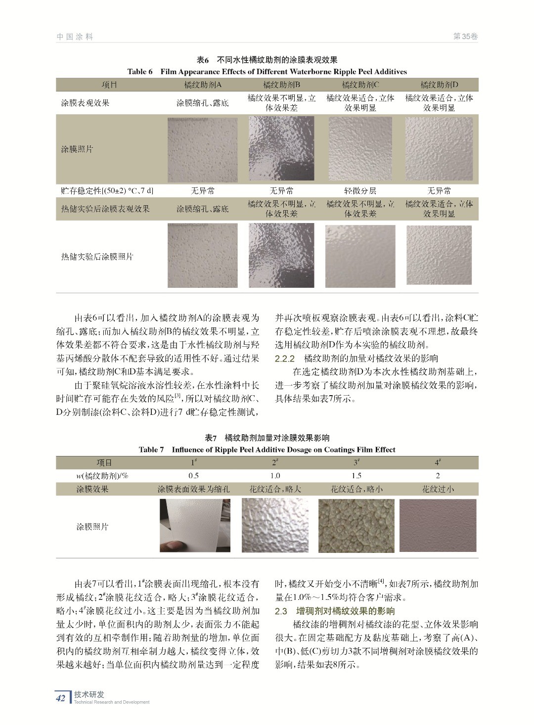 摘要:以水性聚氨酯橘紋漆為研究對象,重點研究了成膜物的選擇對橘紋漆耐性的影響、橘紋助劑的品種和加量以及增稠劑種類對橘紋效果的影響、顏料體積濃度PVC對橘紋效果及貯存性的影響。結果表明:選擇厚涂性、耐化學品性好的羥基丙烯酸分散體作為成膜物,配合立體效果好的橘紋助劑、中剪增稠劑,控制顏料體積濃度PVC在35%~45%,可以得到立體感強、涂膜紋理清晰的水性聚氨酯橘紋漆。
