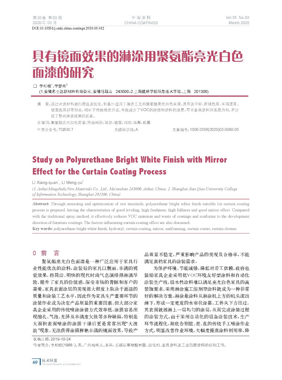 具有鏡面效果的淋涂用聚氨酯亮光白色面漆的研究