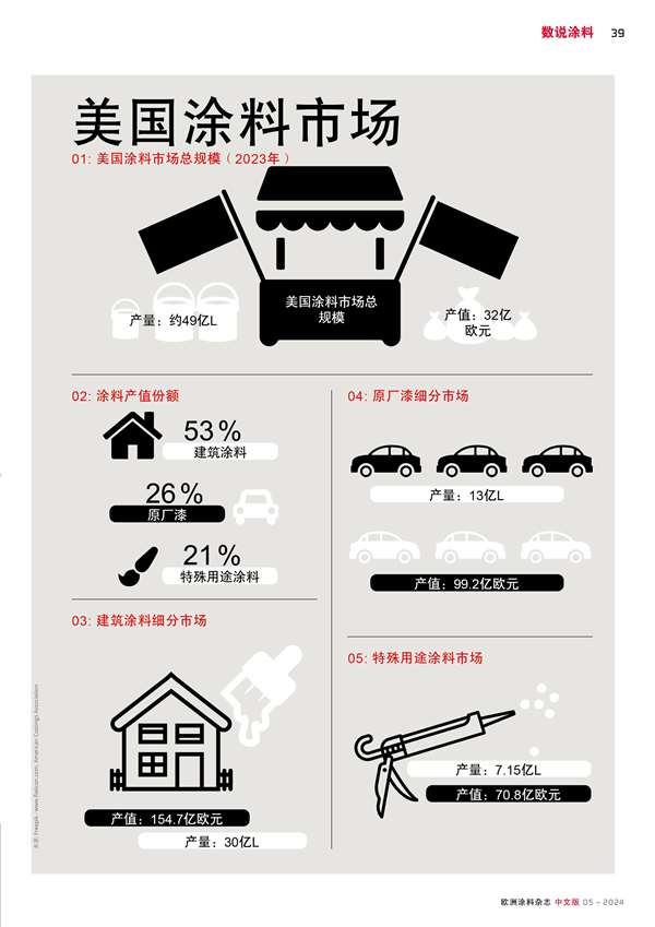 美國涂料市場總規(guī)模( 2023年)產(chǎn)量約49億L,產(chǎn)值 32億歐元