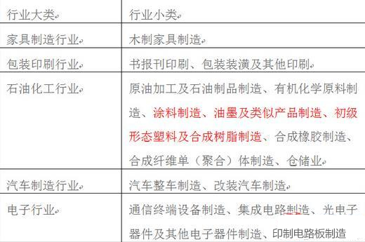 此次征收范圍涉及的5個行業(yè)大類中排放揮發(fā)性有機物的17個行業(yè)小類,具體包括:家具制造行業(yè)的木制家具制造,包裝印刷行業(yè)的書報刊印刷、包裝裝潢及其他印刷,石油化工行業(yè)的原油加工及石油制品制造、有機化學原料制造、涂料制造、油墨及類似產(chǎn)品制造、初級形態(tài)塑料及合成樹脂制造、合成橡膠制造、合成纖維單(聚合)體制造、倉儲業(yè),汽車制造行業(yè)的汽車整車制造、改裝汽車制造,電子行業(yè)的通信終端設(shè)備制造、集成電路制造、光電子器件及其他電子器件制造、印制電路板制造。