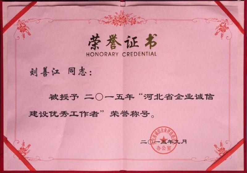 在河北省企業(yè)家協(xié)會(huì)等部門聯(lián)合開展的“河北省誠(chéng)信企業(yè)”評(píng)選活動(dòng)中,河北晨陽(yáng)工貿(mào)集團(tuán)有限公司被評(píng)為2015年“河北省誠(chéng)信企業(yè)”,董事長(zhǎng)劉善江榮獲“河北省企業(yè)誠(chéng)信建設(shè)優(yōu)秀工作者”稱號(hào)。