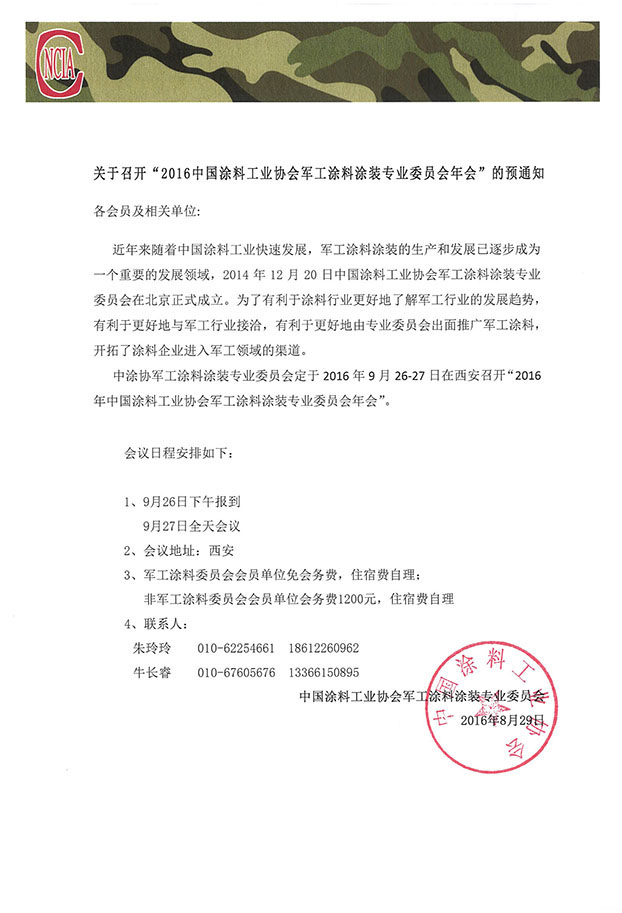 各會員及相關單位: 中涂協軍工涂料涂裝專業委員會定于 2016年9月26-27日 在 西安 召開“2016年中國涂料工業協會軍工涂料涂裝專業委員會年會”。 9月27日全天會議 2、會議地址:西安 3、軍工涂料委員會會員單位免會務費,住宿費自理; 非軍工涂料委員會會員單位會務費1200元,住宿費自理 4、聯系人: 朱玲玲 010-62254661 18612260962 牛長睿 010-67605676 13366150895 中國涂料工業協會軍工涂料涂裝專業委員會 2016年8月29日