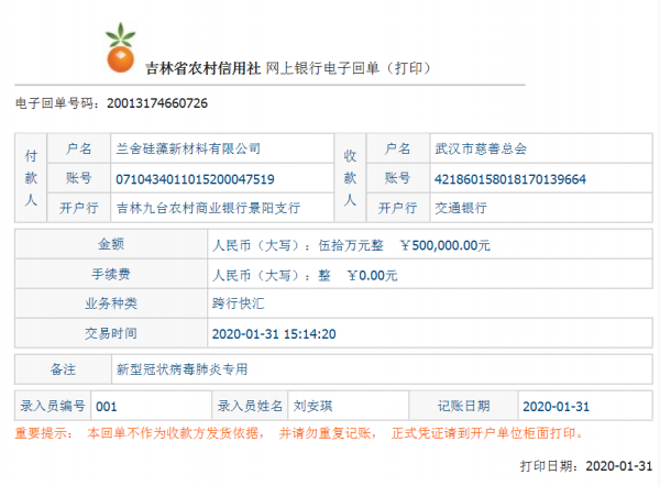 1月31日,蘭舍硅藻新材料有限公司向武漢市慈善總會捐款人民幣50萬元,作為疫情救助專款使用,支援武漢抗擊疫情,同舟共濟,共度難關(guān)。