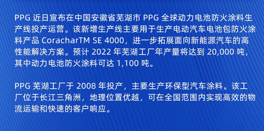 PPG近日宣布在中國安徽省蕪湖市PPG全球動力電池防火涂料生產線投產運營。