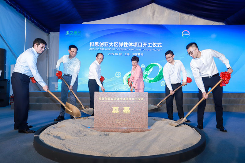 2022年7月8日,科思創(chuàng)彈性體新工廠在上海一體化基地破土動(dòng)工:(左起)科思創(chuàng)彈性體事業(yè)部亞太區(qū)生產(chǎn)總監(jiān)兼項(xiàng)目投資經(jīng)理張品其、科思創(chuàng)上海一體化基地總經(jīng)理陳耘博士、上?;瘜W(xué)工業(yè)區(qū)管理委員會(huì)主任馬靜、科思創(chuàng)中國(guó)區(qū)總裁雷煥麗、科思創(chuàng)彈性體事業(yè)部亞太區(qū)總監(jiān)陳敏、上海寰球工程有限公司總經(jīng)理李宇鵬