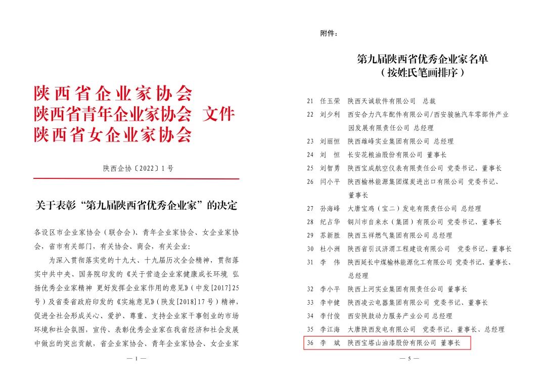 近日,由陜西省企業(yè)家協(xié)會(huì)于2021年-2022年在全省范圍內(nèi)聯(lián)合開展的評選“第九屆陜西省優(yōu)秀企業(yè)家”活動(dòng)落下帷幕,經(jīng)過現(xiàn)場考評、網(wǎng)絡(luò)公示等嚴(yán)格考核,在陜西省范圍內(nèi)共評選出84名優(yōu)秀企業(yè)家,陜西寶塔山油漆股份有限公司董事長李斌獲評“第九屆陜西省優(yōu)秀企業(yè)家”稱號。