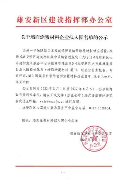 七月流火,白駒過隙,八月伊始,再傳喜訊:8月1日,雄安新區(qū)建設(shè)指揮部辦公室發(fā)布了關(guān)于墻面涂覆材料企業(yè)擬入圍名單的公示,久諾集團(tuán)憑借高質(zhì)量產(chǎn)品、系統(tǒng)的涂裝解決方案以及專業(yè)配套服務(wù)的強(qiáng)大優(yōu)勢(shì)赫然上榜!