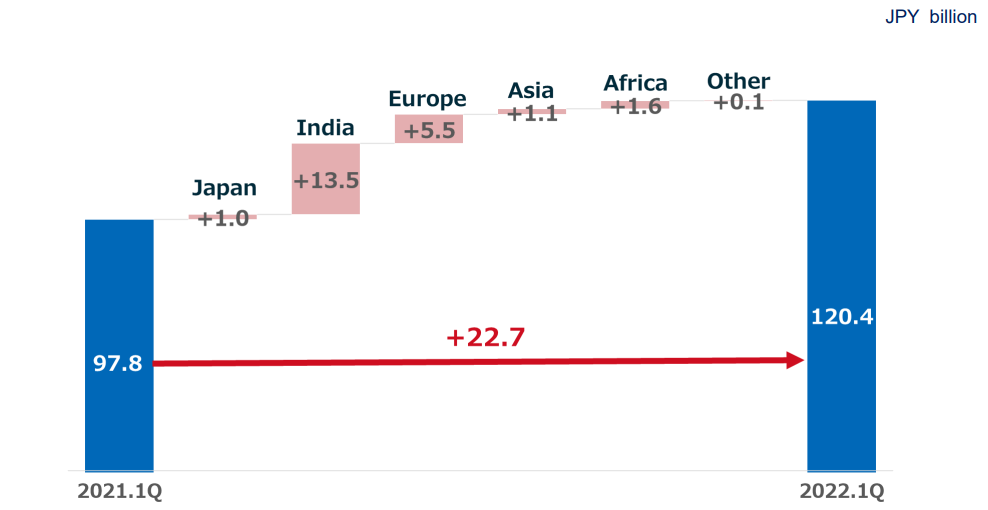 涂料產(chǎn)品類別銷售收入增長情況從銷售區(qū)域來看,關(guān)西涂料各地區(qū)的銷售額普遍增長,尤其是印度地區(qū)的爆發(fā)性增長,極大地支撐了關(guān)西涂料的整體銷售業(yè)績。日本銷售額增長10億日元,印度增長135億日元,歐洲增長11億日元,亞洲和非洲增長11億和16億日元。