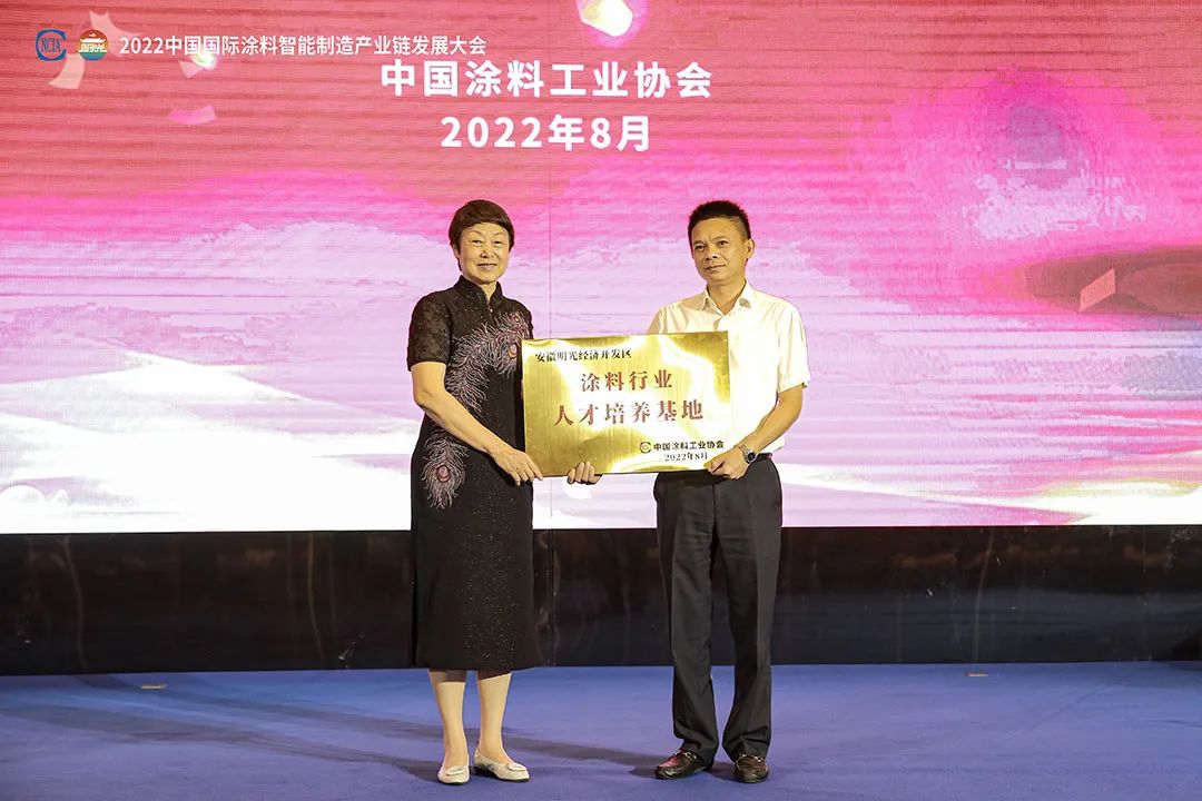 會上中國涂料工業(yè)協(xié)會會長孫蓮英為明光市經(jīng)濟(jì)開發(fā)區(qū)“涂料行業(yè)人才培養(yǎng)基地”授牌,并和明光市人民政府副市長劉靜為《涂料行業(yè)智能工廠通用技術(shù)要求》、《涂料行業(yè)智能工廠評價規(guī)范》主要起草單位珠海市長陸工業(yè)自動控制系統(tǒng)股份有限公司、暨南大學(xué)等頒發(fā)證書;中國涂料工業(yè)協(xié)會副會長、武漢雙虎涂料有限公司董事長蔣紅升和安徽明光經(jīng)濟(jì)開發(fā)區(qū)黨工委書記、管委會主任賈寶兵為標(biāo)準(zhǔn)參加起草單位嘉寶莉化工集團(tuán)股份有限公司等頒發(fā)證書。