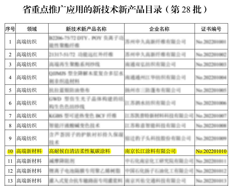 日前,江蘇省新技術新產品推廣應用工作聯席會議辦公室頒布了第28批“省重點推廣應用的新技術新產品目錄”,憑借自主創(chuàng)新水平和在重防腐領域的突出表現,長江“高耐候自清潔柔性氟碳涂料”再次上榜新產品名錄!