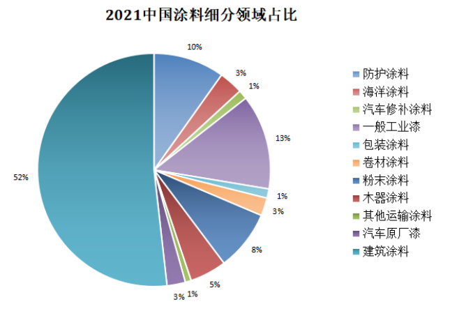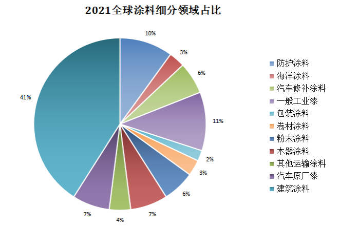 劉杰指出,從2021年中國與全球涂料行業(yè)細(xì)分對比來看,中國涂料行業(yè)細(xì)分領(lǐng)域占比與全球涂料細(xì)分領(lǐng)域占比并無太大差異,建筑涂料占比最大,其次是防護(hù)涂料。