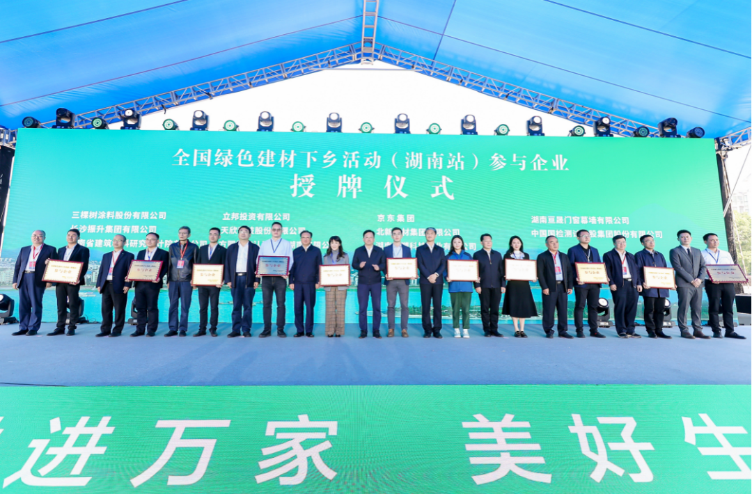 2022年全國綠色建材下鄉活動湖南站于11月1日在岳陽湘陰縣正式啟動。三棵樹全面支持綠色建材下鄉活動,積極開展全國綠色建材領軍企業惠民行動,獲得由湖南省工業和信息化廳、岳陽市人民政府特別頒發的“參與企業”授牌。