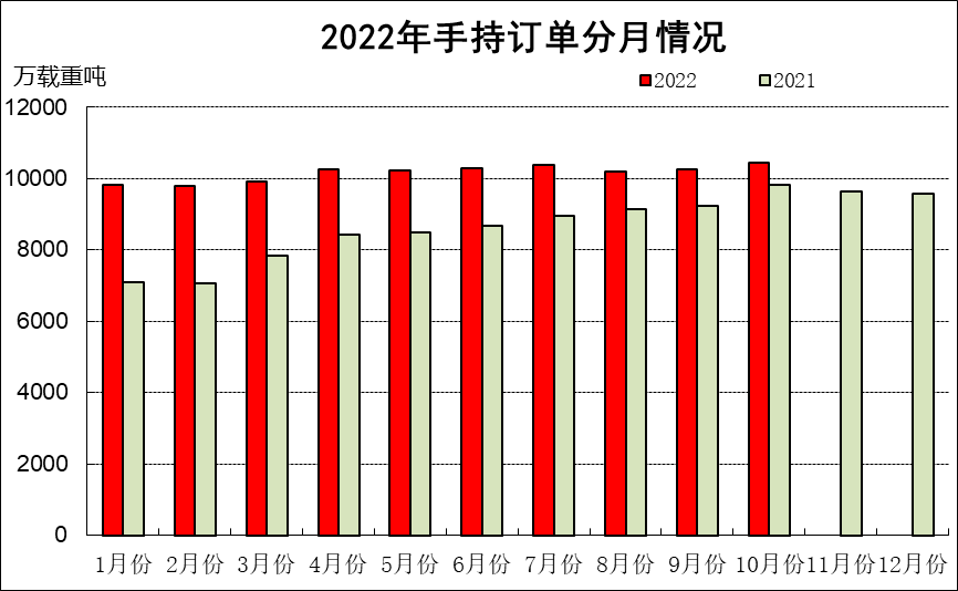 全國(guó)完工出口船2592萬(wàn)載重噸,同比下降13.4%;承接出口船訂單3388萬(wàn)載重噸,同比下降39.0%;10月末手持出口船訂單9337萬(wàn)載重噸,同比增長(zhǎng)6.6%。出口船舶分別占全國(guó)造船完工量、新接訂單量、手持訂單量的84.0%、90.6%和89.4%。