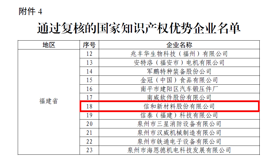 信和于2016年首次通過國家知識產(chǎn)權(quán)優(yōu)勢企業(yè)認(rèn)定,2019年順利通過了一輪復(fù)核認(rèn)定,本次第二輪的復(fù)核認(rèn)定,是政府對信和歷年來在知識產(chǎn)權(quán)領(lǐng)域取得成績的肯定,充分體現(xiàn)了信和良好的科技創(chuàng)新能力和突出的綜合競爭優(yōu)勢,有利于進(jìn)一步推動公司知識產(chǎn)權(quán)的發(fā)展和管理、不斷增強(qiáng)公司的核心競爭力。
