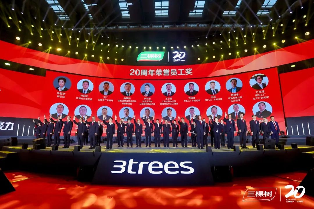 在表彰環(huán)節(jié),60名合作伙伴獲得三棵樹“20周年優(yōu)秀合作伙伴”榮譽(yù);20名三棵樹奮斗者獲頒“20周年貢獻(xiàn)獎(jiǎng)”,另有20名陪伴三棵樹20年一起成長的奮斗者獲頒“20周年榮譽(yù)員工獎(jiǎng)”。多名合作伙伴代表上臺(tái)領(lǐng)獎(jiǎng)并發(fā)表感言,2名員工代表做了深情分享。投融資機(jī)構(gòu)代表發(fā)表致辭,高度評(píng)價(jià)了三棵樹在資本市場的良好表現(xiàn)。
