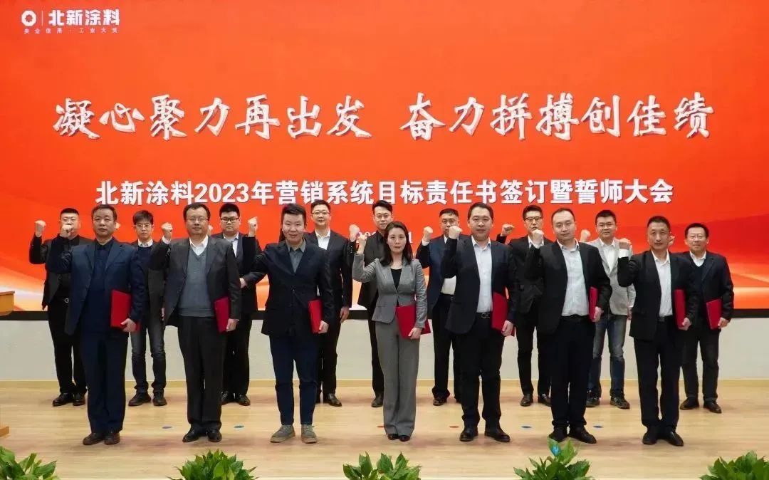 2月1日,北新涂料2023年營銷系統目標責任書簽訂儀式暨誓師大會在北京未來科學城北新建材總部舉行。北新涂料領導班子成員,龍牌涂料、燈塔涂料營銷系統全體成員以及總部職能部門負責人通過現場+視頻的形式參加了會議。