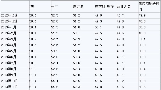 2013年11月,構成制造業PMI的5個分類指數2升3降。生產指數為54.5%,比上月略升0.1個百分點,連續5個月回升,為2012年5月以來的最高點。新訂單指數為52.3%,比上月回落0.2個百分點。調查顯示,反映制造業外貿情況的新出口訂單指數為50.6%,比上月上升0.2個百分點,連續4個月位于臨界點以上;進口指數為50.5%,比上月上升0.5個百分點。
